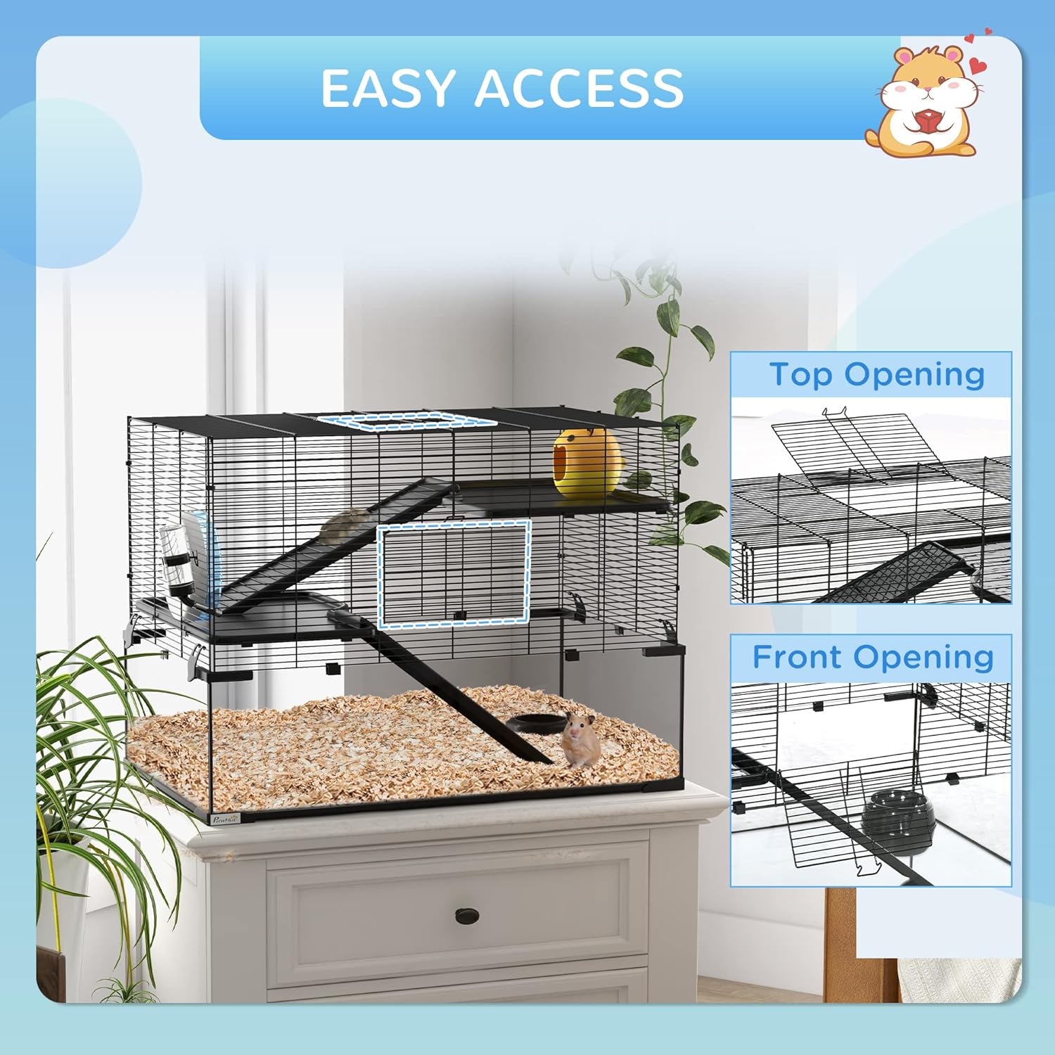 • Easy Cleaning and Access: The big hamster cage's frame attaches to the glass bottom with clips, making disassembly quick and cleaning hassle-free. A front door and a top opening provide easy access to your pet.