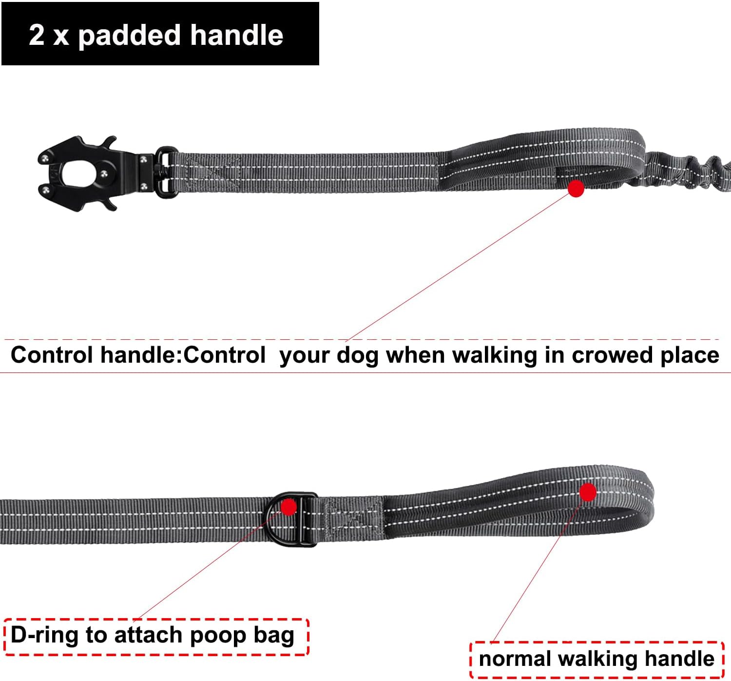 • [ Practical and Convenient ]: The rear handle of leash has a D-ring for attaching a dog waste bag. During leash-free training or playtime, the leash can be worn diagonally across your body