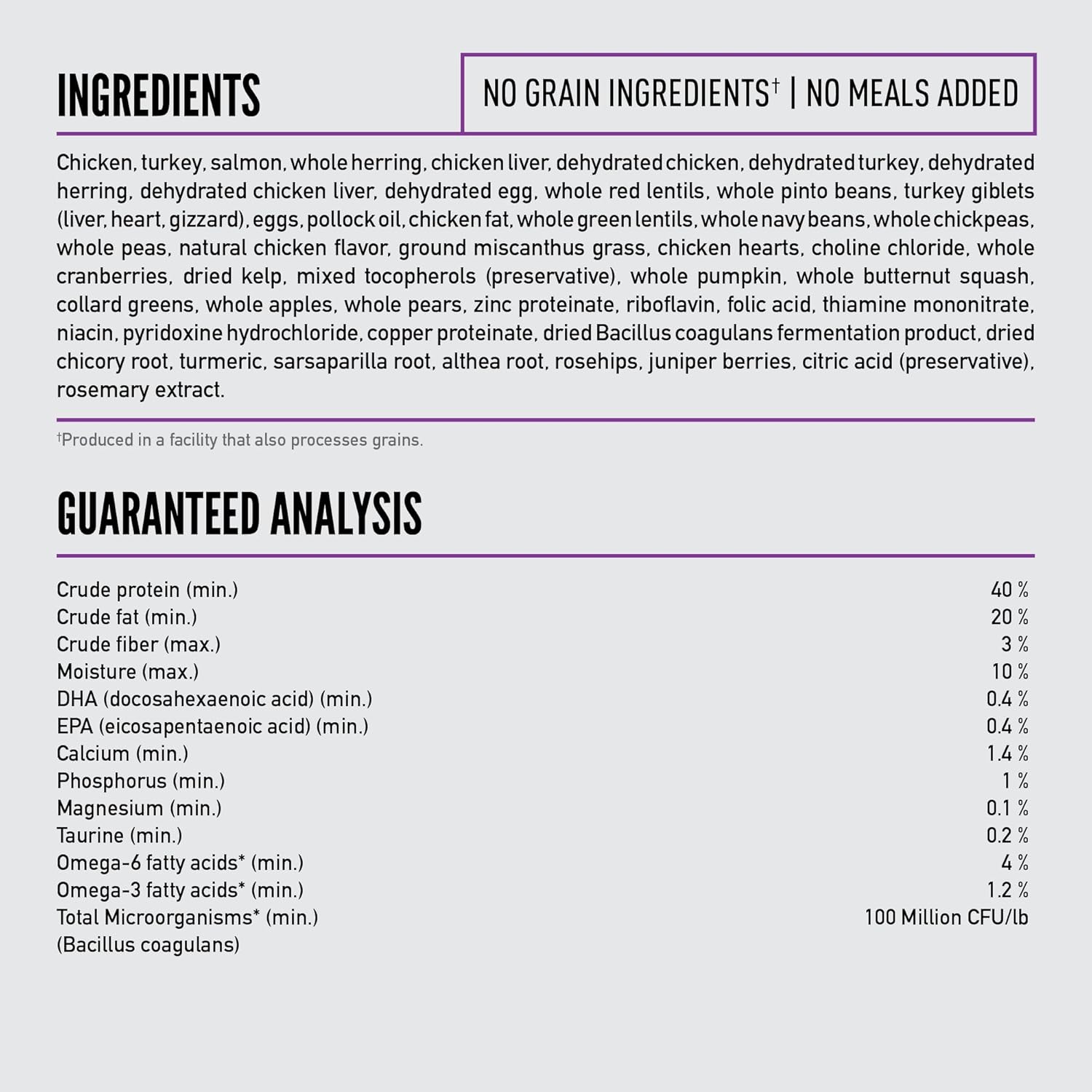• First five ingredients of this ORIJEN cat food are fresh or raw** free-run*** chicken and turkey, wild-caught salmon, whole herring and chicken liver, providing a strong source of essential protein, vitamins, and minerals