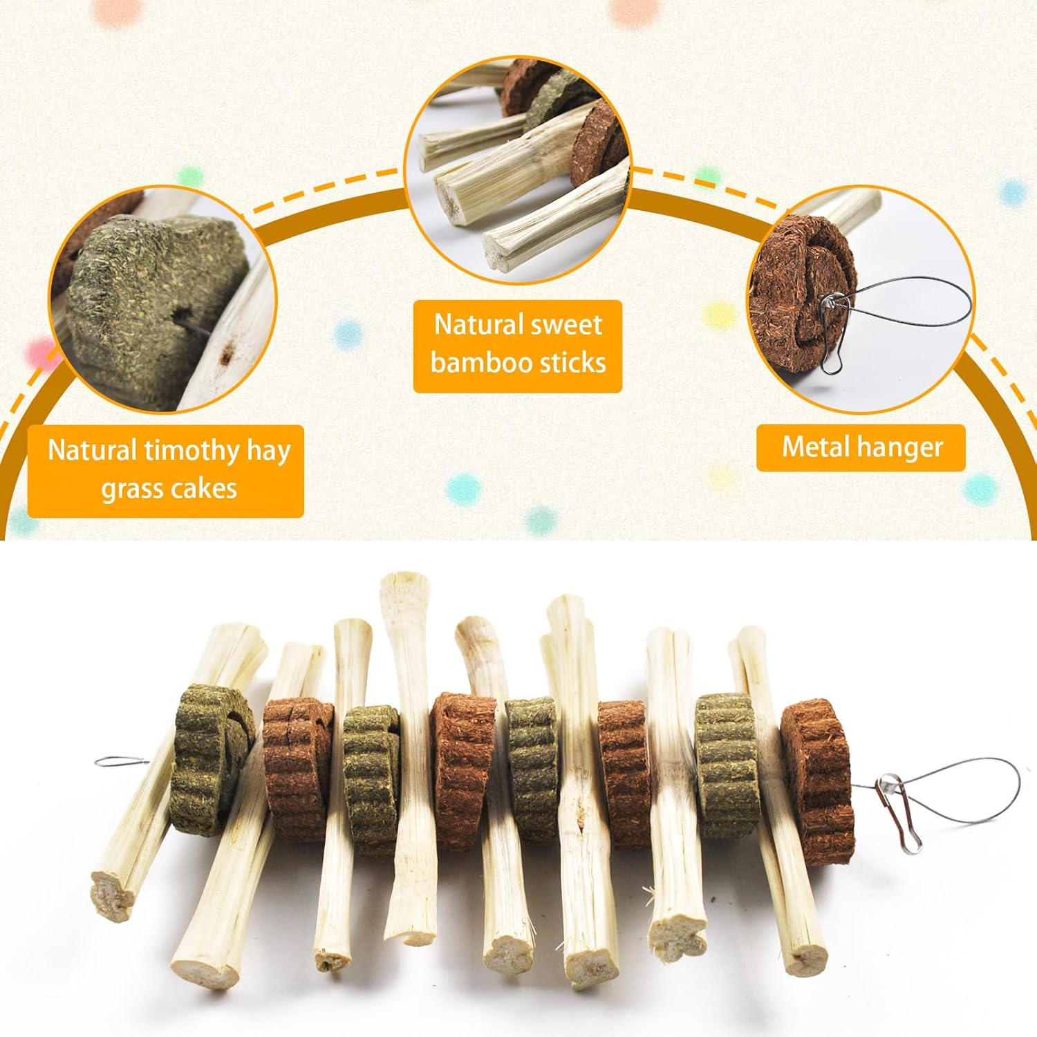 • 【Natural Snacks】Bunny chew toys for teeth grinding include sweet bamboo sticks, timothy hay cakes and carrot cakes. bunny chew toys for rabbits can be used as a balanced and healthy snack for them.