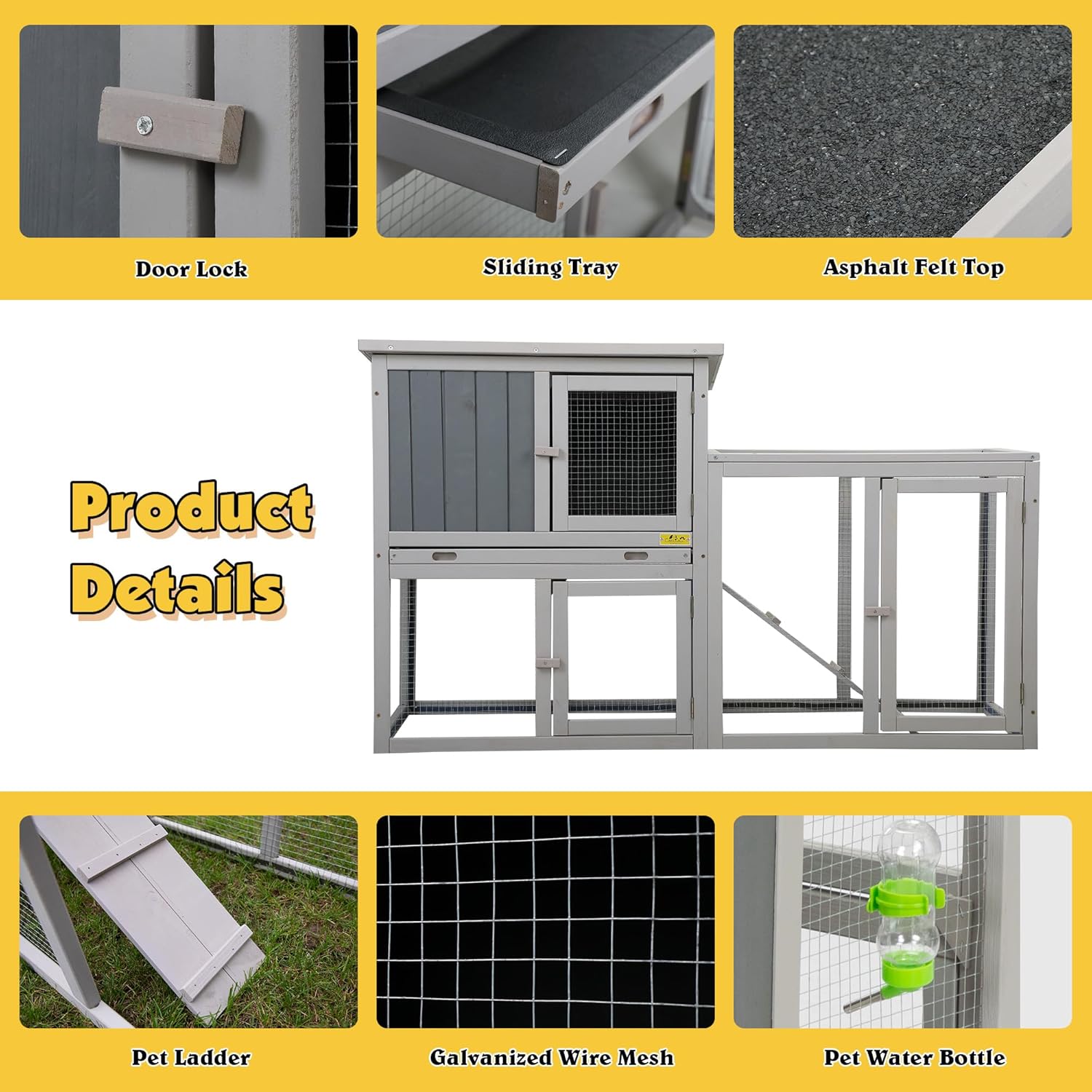 • [Easy to Clean]๏ผšThe attic of rabbit hutch outdoor is equipped with a sliding tray contributing to provide a comfortable and sanitary environment. The smooth surface and high hardness plastic can be cleaned by rinsing with water only. An openable roof and two front doors for easily cleaning and feeding.