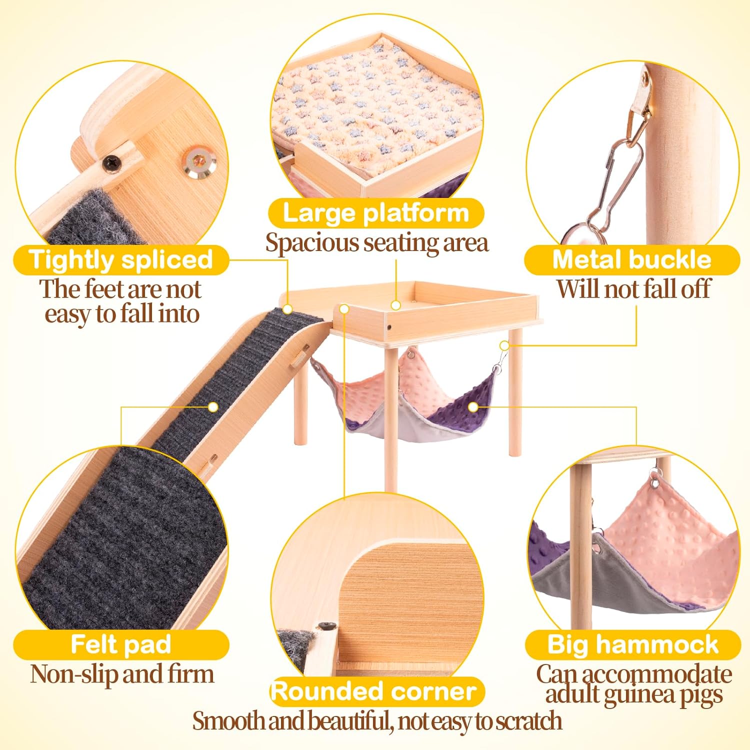 • 【LARGE SIZE】Platform:12.99x12.99 in, Hammock: 11.81x11.81 in, Stairs:13.78x6.30 in This guinea pig hammock and platform is designed to be large and suitable for guinea pigs of all ages. There are guardrails above the platform to protect the guinea pigs. The stairs are wide enough with felt pads on them so the guinea pigs can easily climb them. This design can help guinea pigs exercise and play well.