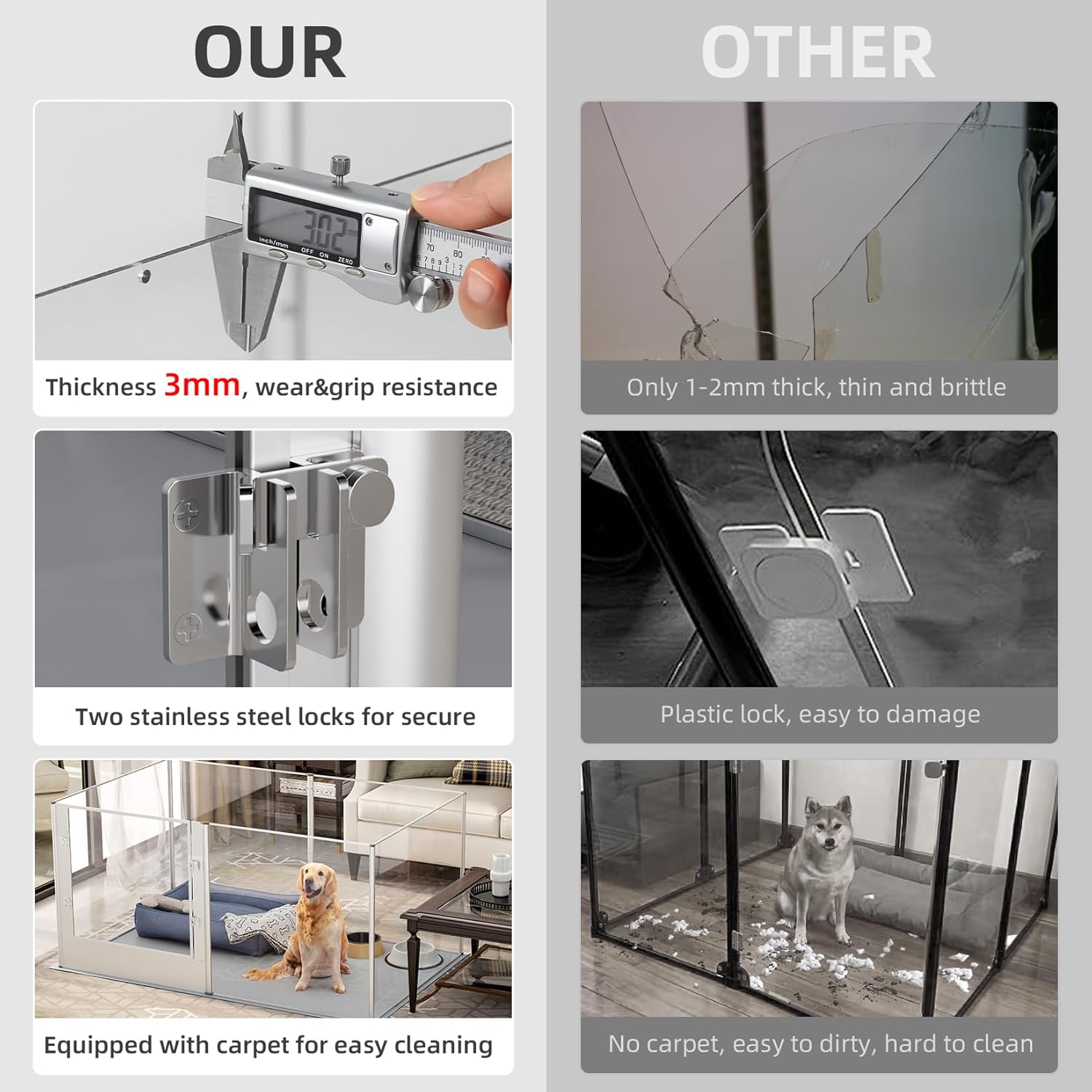 - 32"Tall & Innovative Material - Compared to the metal and wood fences,our fence is heighten and lengthen,32"tall and 52"long,also a new innovative acrylic fence design,perfect blend of high-transparency acrylic panel and anti-oxidant aviation aluminum frame for a high class look,offering functionality and style, overall weighs 48lbs with nonslip pad,effectively prevent dogs from jumping out and pushing,large spacious space to keep dog mom and puppies safely contained