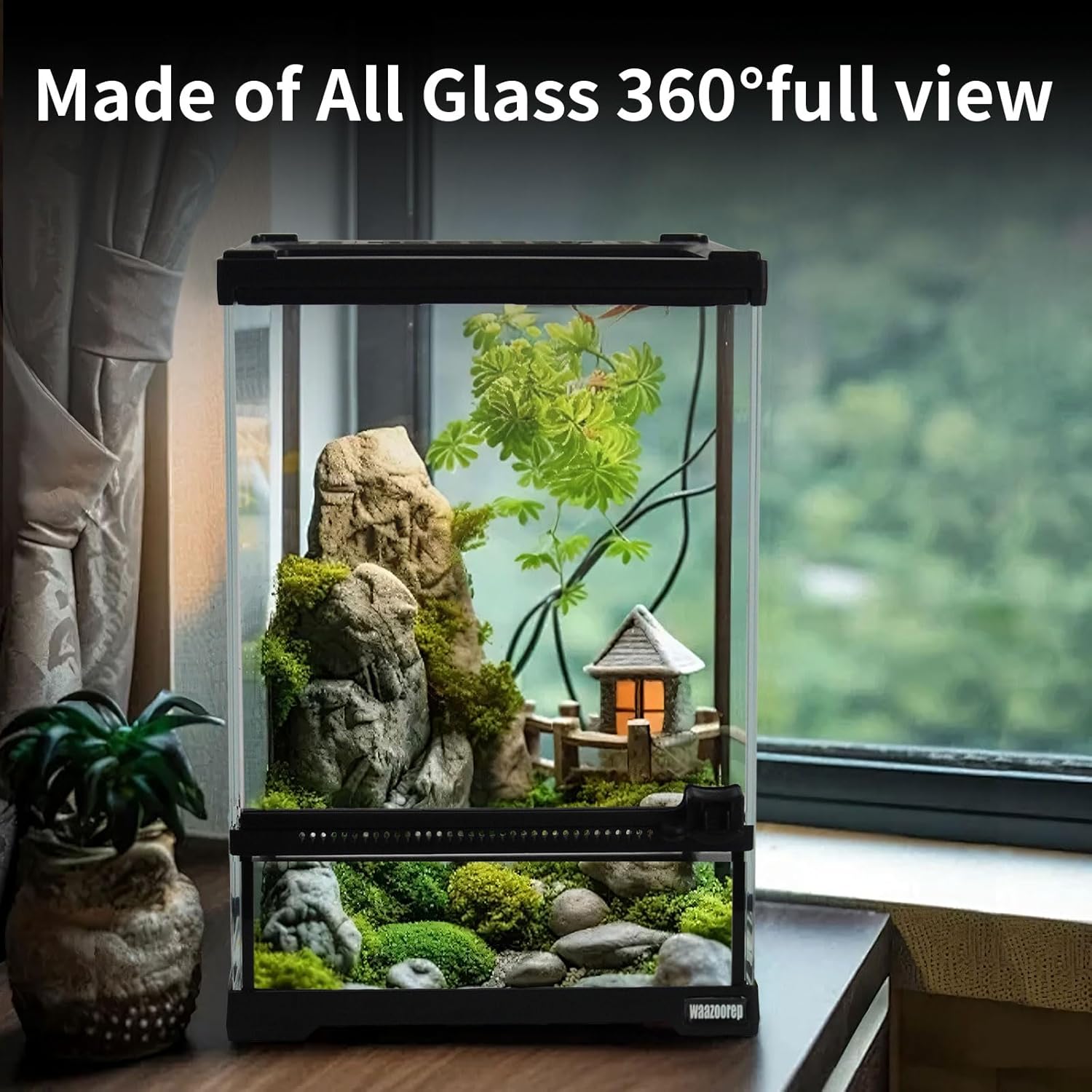 • 【Compact Design Mini Glass Container】: Made of premium thick glass base for extra safety. The front door with one hand opens separately, making this reptile terrarium easy to access and easy to clean, decorate and maintain. Specially designed locks also help prevent escapes