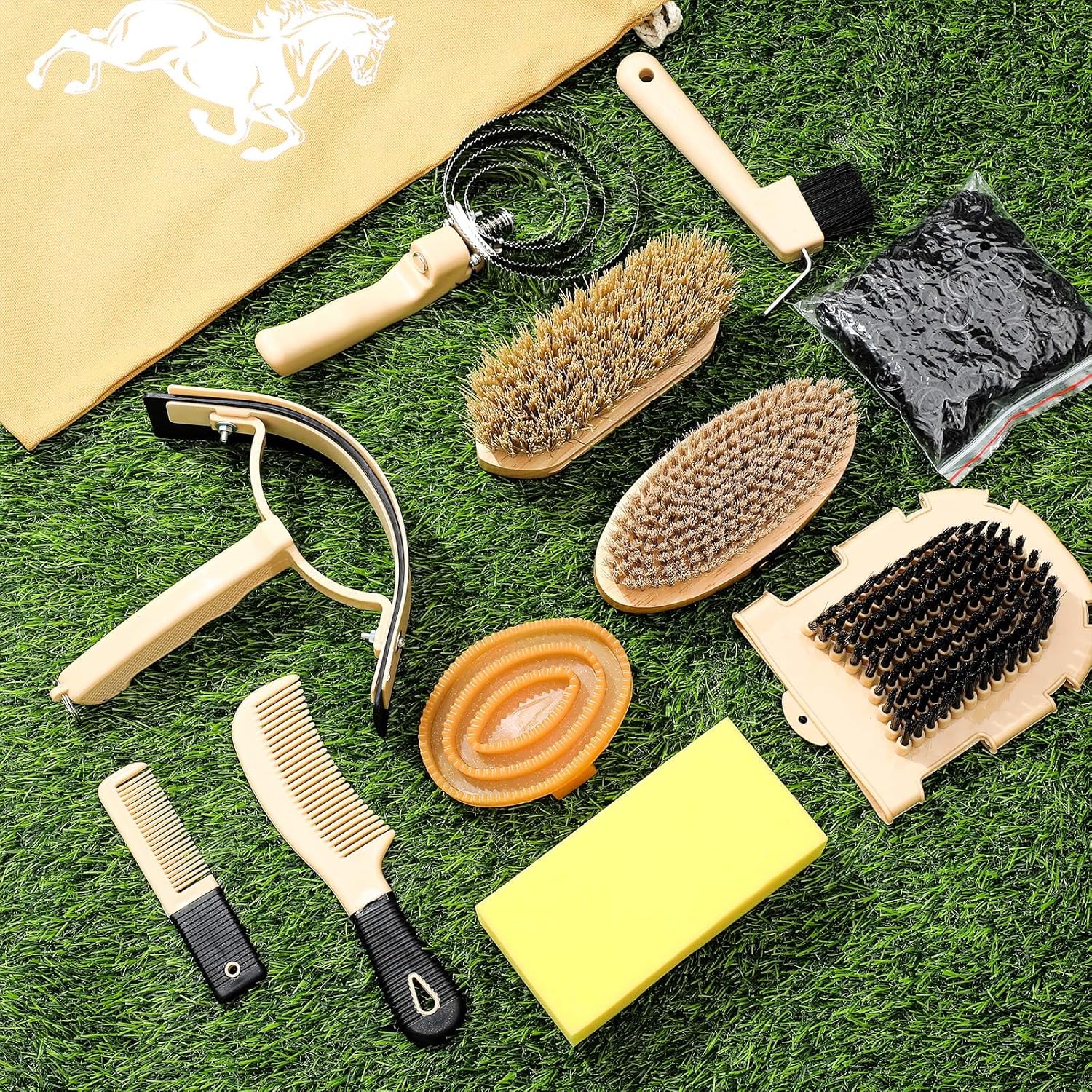 • Horse Grooming Kit: this horse grooming set includes storage bag, oval massage brush, hard brush, soft brush, sweat scraper, bath sponge, hoof pick with brush, mane comb, tail comb, rubber band, etc., a total of 12 pieces, such a nice and complete grooming set can satisfy your needs for grooming your horse