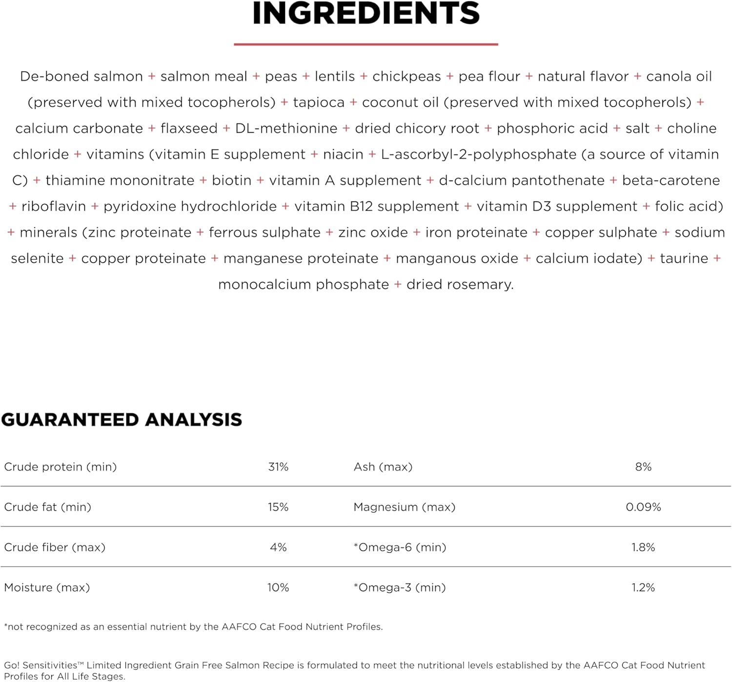 • LIMITED INGREDIENTS FOR SENSITIVE CATS: Go! Solutions Sensitivities recipes are thoughtfully crafted for cats with sensitive stomachs and food allergies using minimal ingredients while meeting nutritional needs