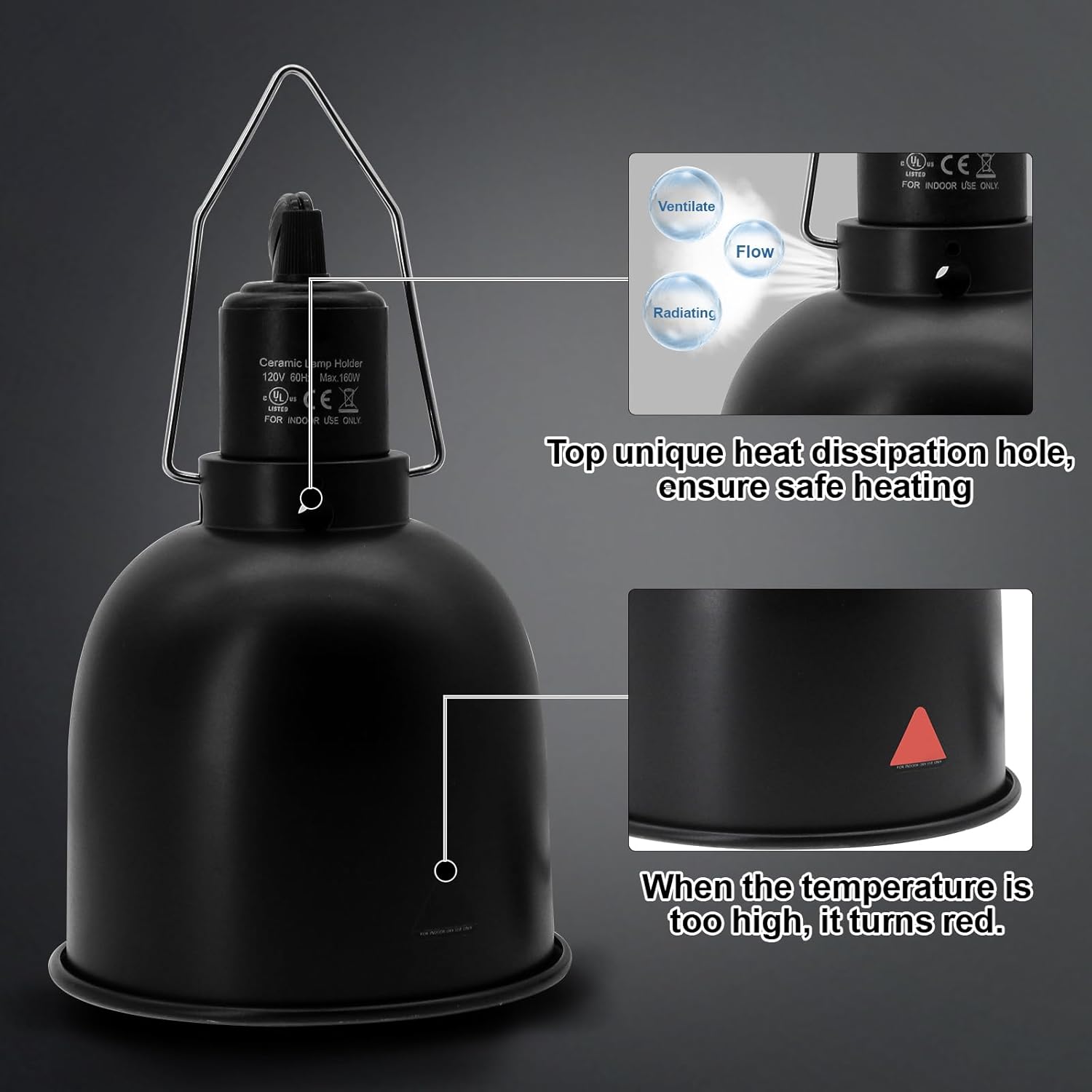 • Portable Hook - The sturdy and heat-resistant E26 ceramic lamp head ensures long-term use and can withstand up to 160W. The stainless steel hook at the top works with any reptile lamp stand and remains stable.