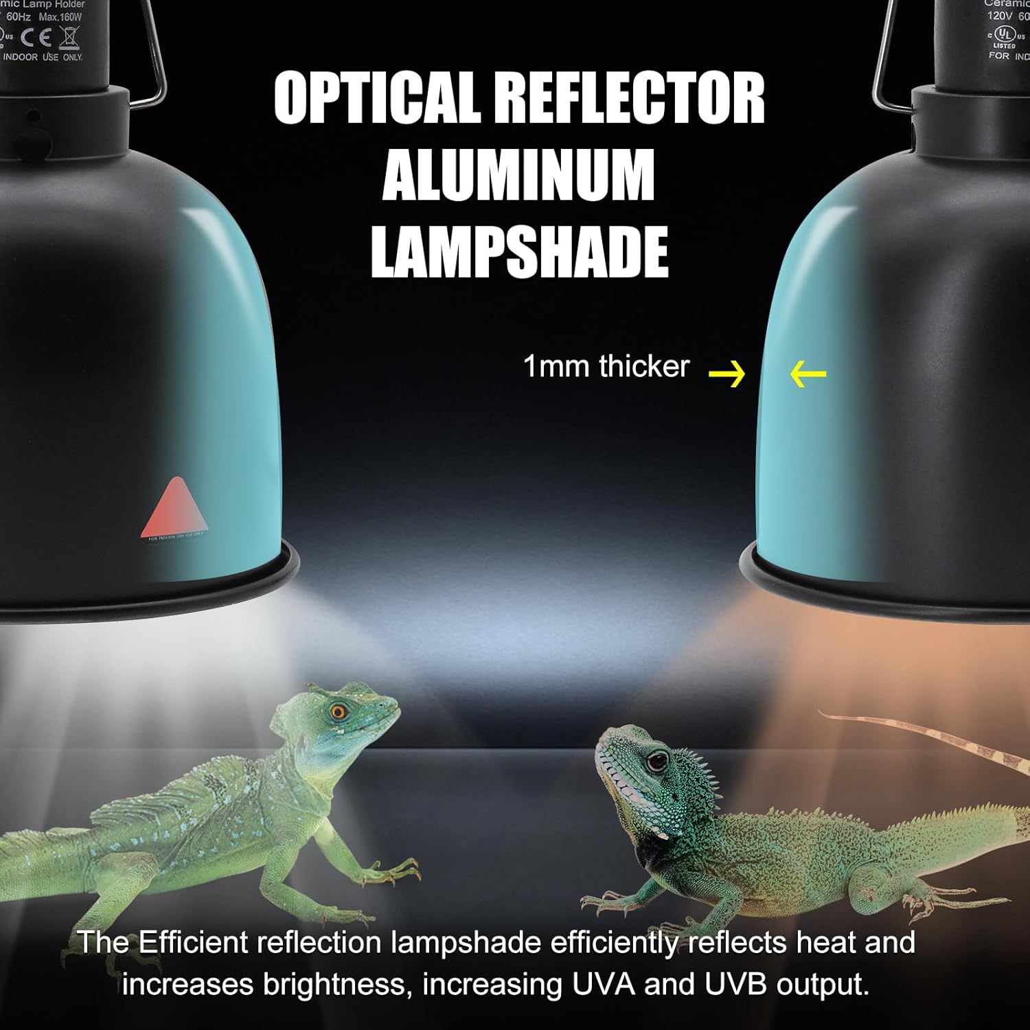 • Great Aluminum & High Reflection - Our dimmable lampshade is made of high-quality aluminum, and the inside of the lampshade is finely polished to effectively reflect heat and increase brightness, which can significantly increase UVA and UVB output. The thickness of the lamp wall is 1mm, ensuring it has better high temperature resistance and is not easily deformed.