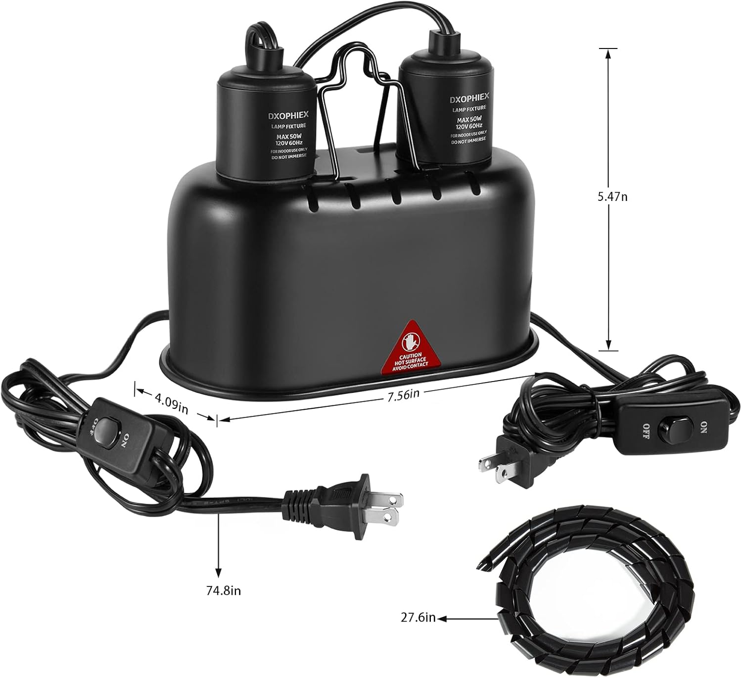 - 【Dual Lamp Fixture&Max 40 W】:The reptile lamp fixture can be matched with two bulbs at the same time and each socket can bear max 40W. Suitable for various types of heat lamp for reptiles (heating lamps, ceramic heating lamps, UVB reptile lamps, daylight lamps and nightlight lamps).In addition to the two 60W heating lamps supplied with the fixture, you can also freely exchange bulbs with heights and widths within 4 inches based on your actual usage needs.