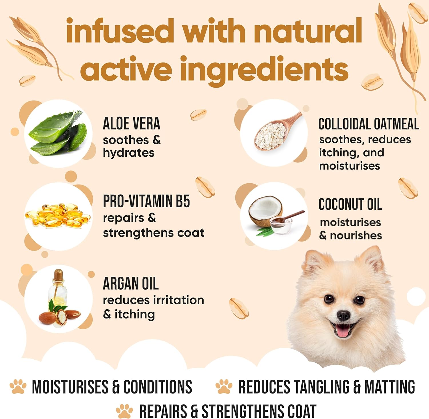 • SOOTHING ALOE VERA - We know your pampered pooch deserves the best. That's why we've packed 99% bio-active aloe vera into this moisturising conditioner. Filled with amino acids, antioxidants, and nourishing vitamins, this Oatmeal conditioner will tame matted coats and prevent static for easier dematting and detangling.