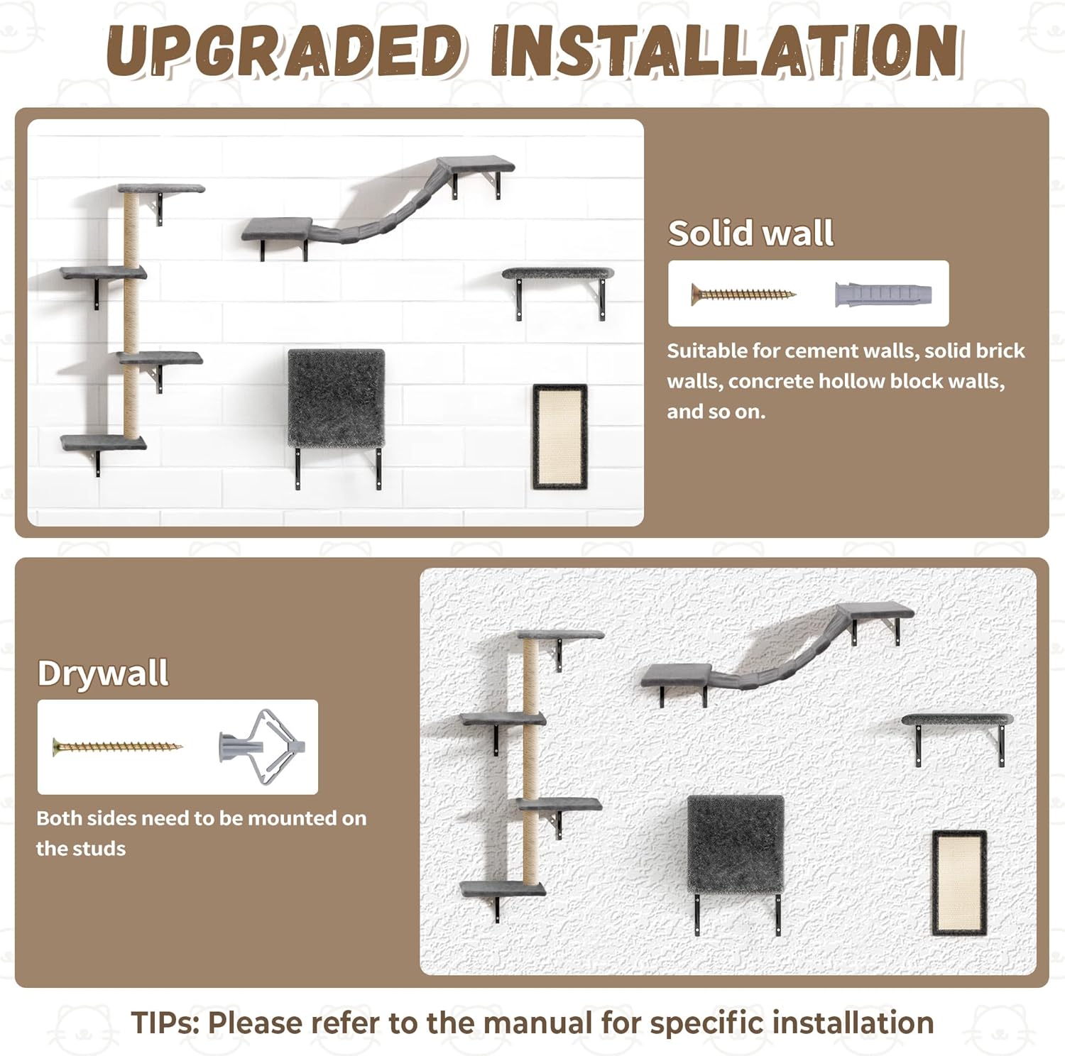 • Stylish and Easy to Install: Our wall-mounted cat shelves feature a sleek, modern design that seamlessly integrates with any home decor. All components are labeled and pre-drilled, accompanied by detailed instructions, making installation quick and hassle-free. You can also customize your cat's activity routes to suit your needs, adding fun to both your and your cat's daily life.