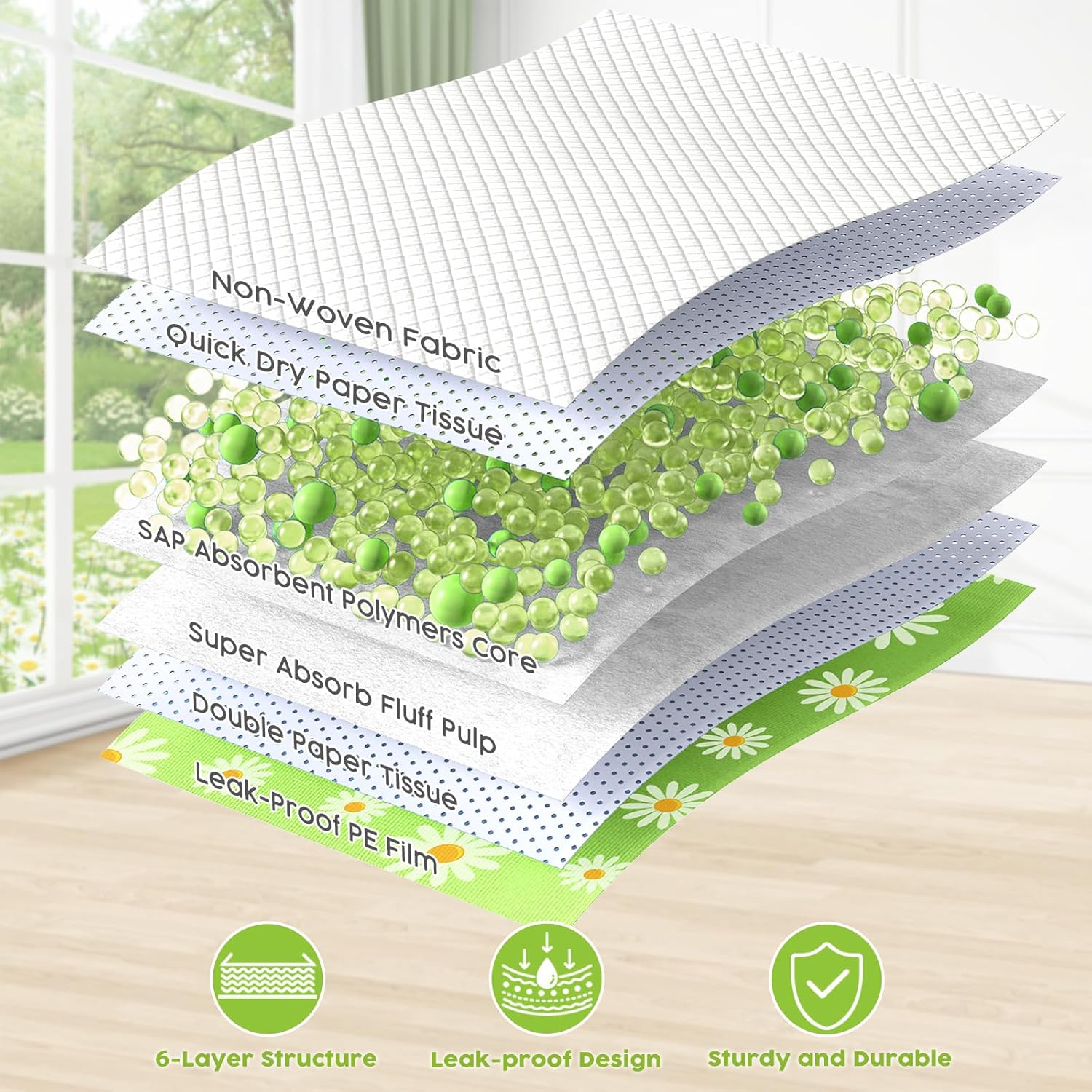 • 6-Layer Leak-Proof System: Our advanced design features a quick-dry top layer, a super-absorbent core that turns liquid into gel, and a leak-proof backing to lock in moisture