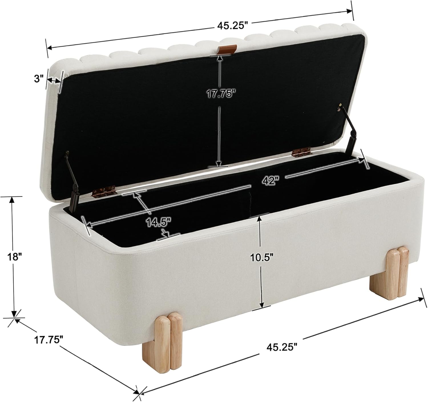 • SIZE DEMENSION AND STORAGE SPACE-Overal size:17.75"Dร—45.25"W ร— 18"H; Internal storage space: 14.5"Dร—42"W ร— 10.5"H. Not only is it an elegante furniture that can enhance aesthetics, but it is also an large additional storage space. In addition, it slows down the speed of lid closure and increases usage safety, especially when used as a storage stool for children's toys
