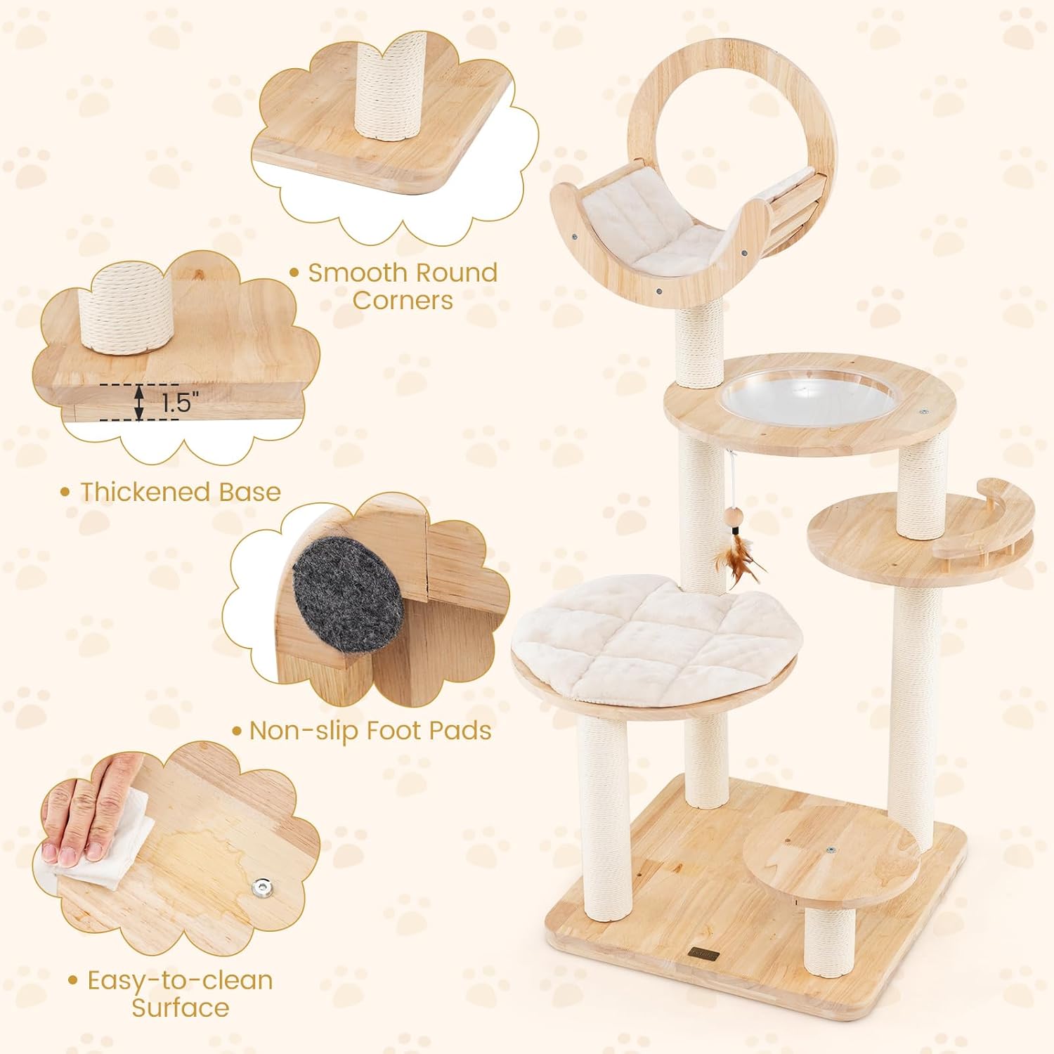 • [Trustworthy Wooden Materials]: Crafted from a blend of premium pine and rubber wood, our cat tower features a sturdy, thickened base for stability. Non-slip foot pads safeguard your floors while smooth, rounded corners ensure a safe play area for your beloved feline friends.