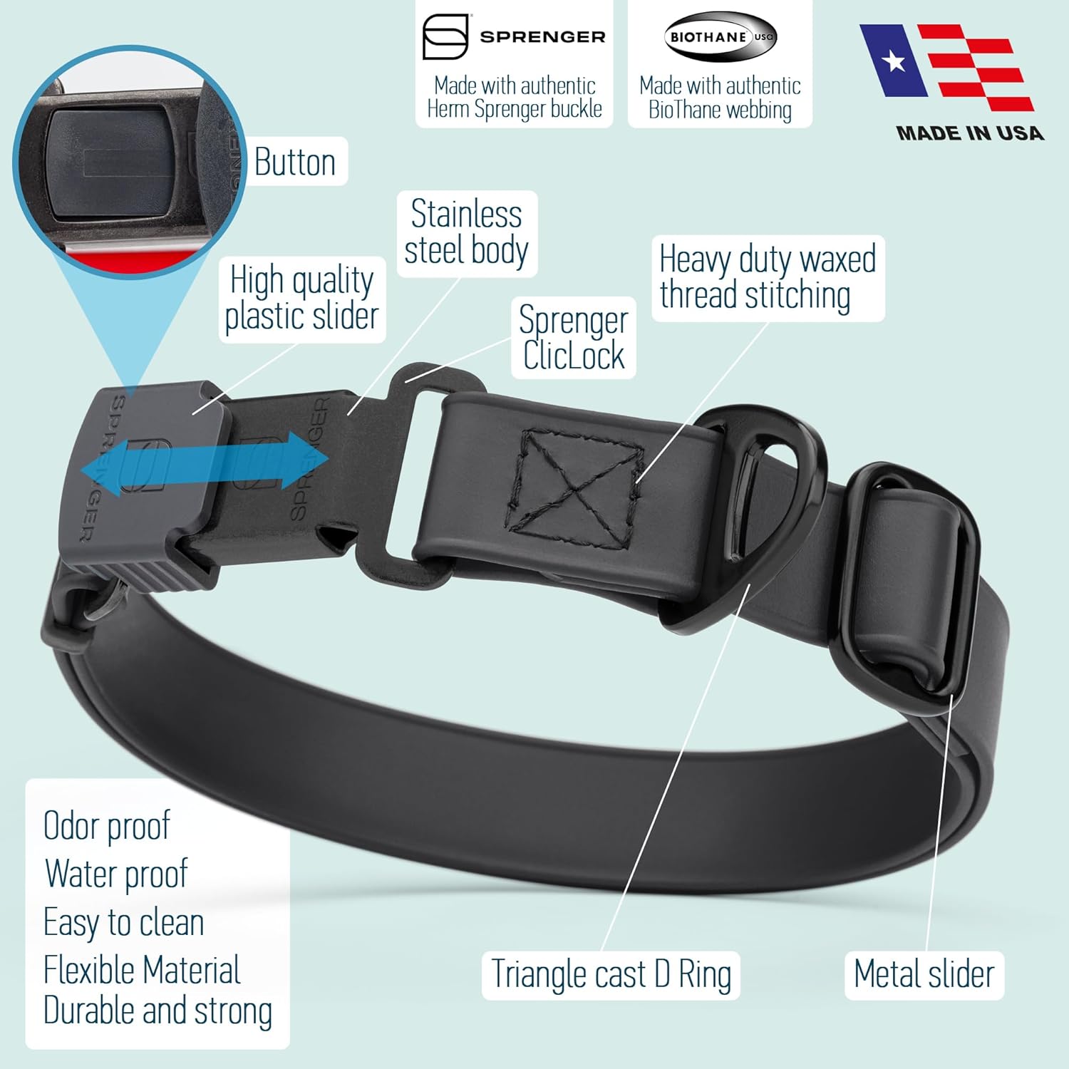 • Made to Last: Our tactical dog collar is proudly made in the US, employing premium quality materials, a combination of authentic biothane webbing, heavy duty waxed thread stitching, stainless steel welded D-ring with quick release buckle. This collar is designed to withstand the test of time, extreme hot and cold temperatures, water, swimming, snow and more!