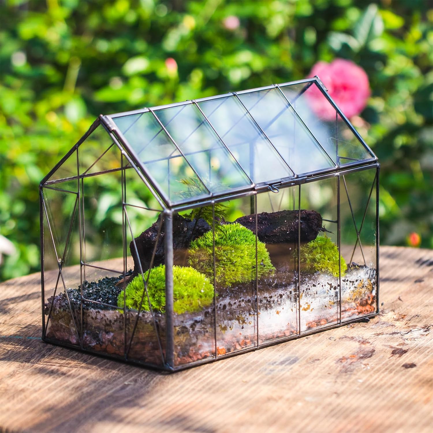 • This is a vintage style house shape geometric terrarium with swing lid, inspired by vintage old glass greenhouse. Victorian time, suitable for fern, small tropical plants, miniature fairy garden