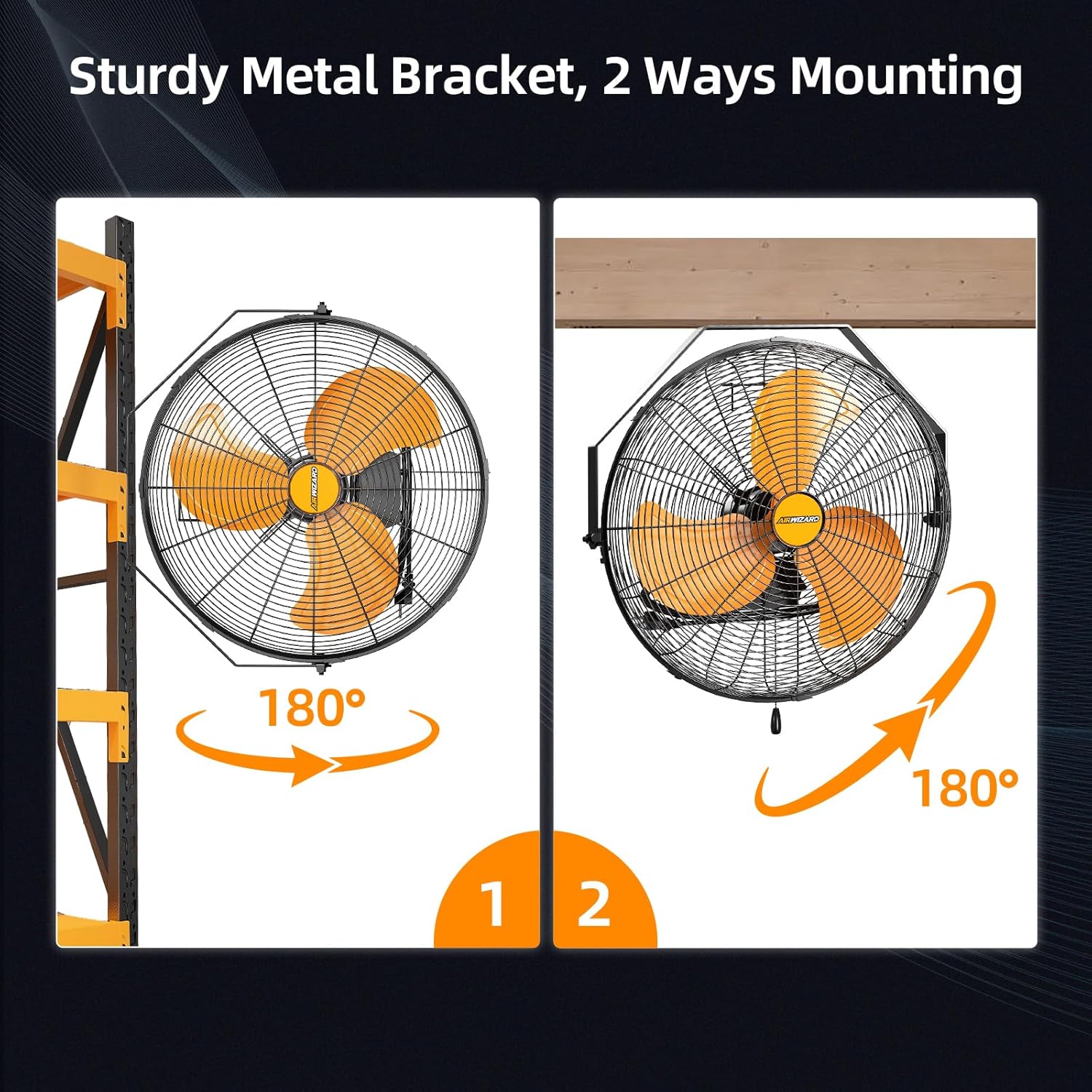 • 2 WAYS MOUNTING - You don't need to assembly the fan, using new bracket made out of power-coated steel construction hang the fan on the wall or the ceiling. This Industrial wall fan can tilt a full 180°, just switching the adjustment knob to direct air exactly where you need it.