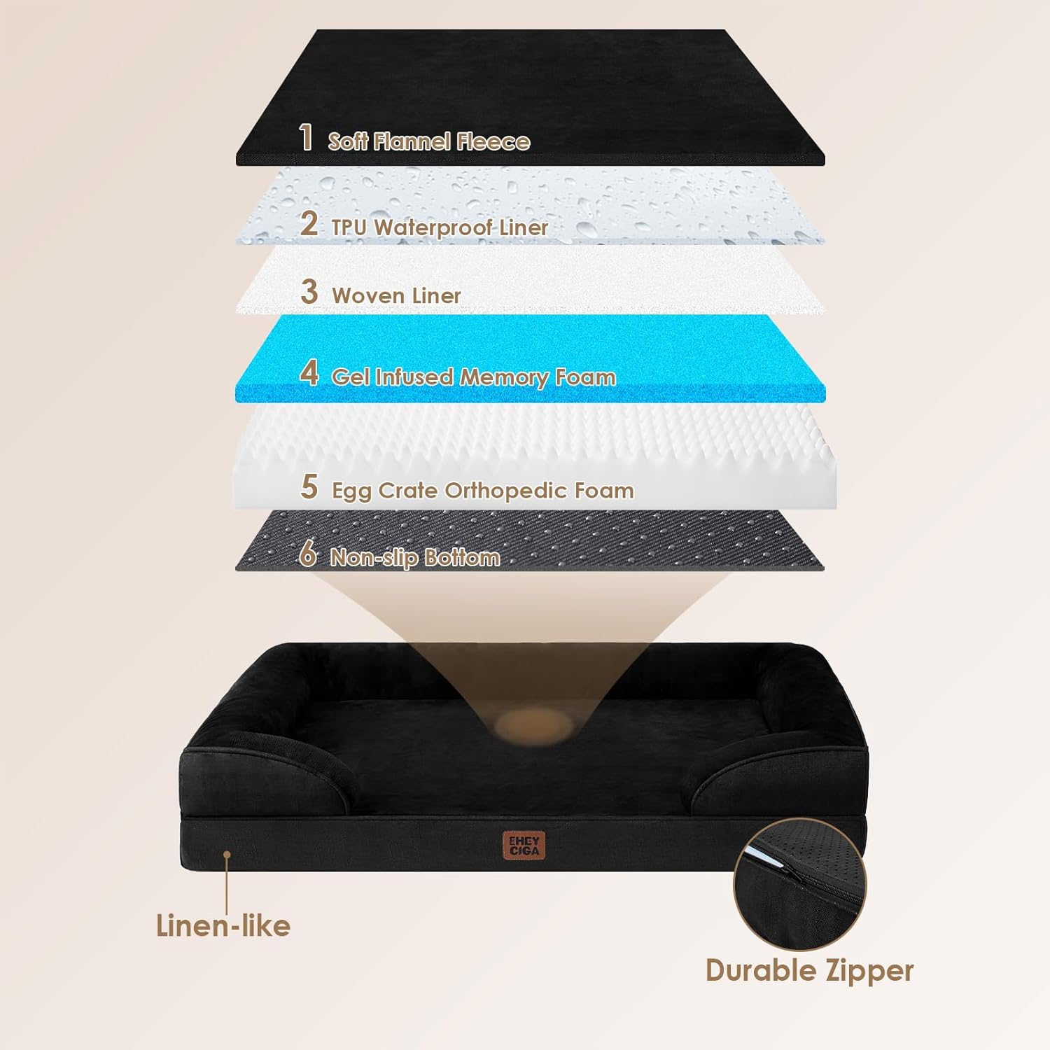 • WATERPROOF COVER: A waterproof film is positioned between the fleece surface and the bottom fabric, ensuring the dog bed remains dry. However, the faux linen sides are not waterproof.