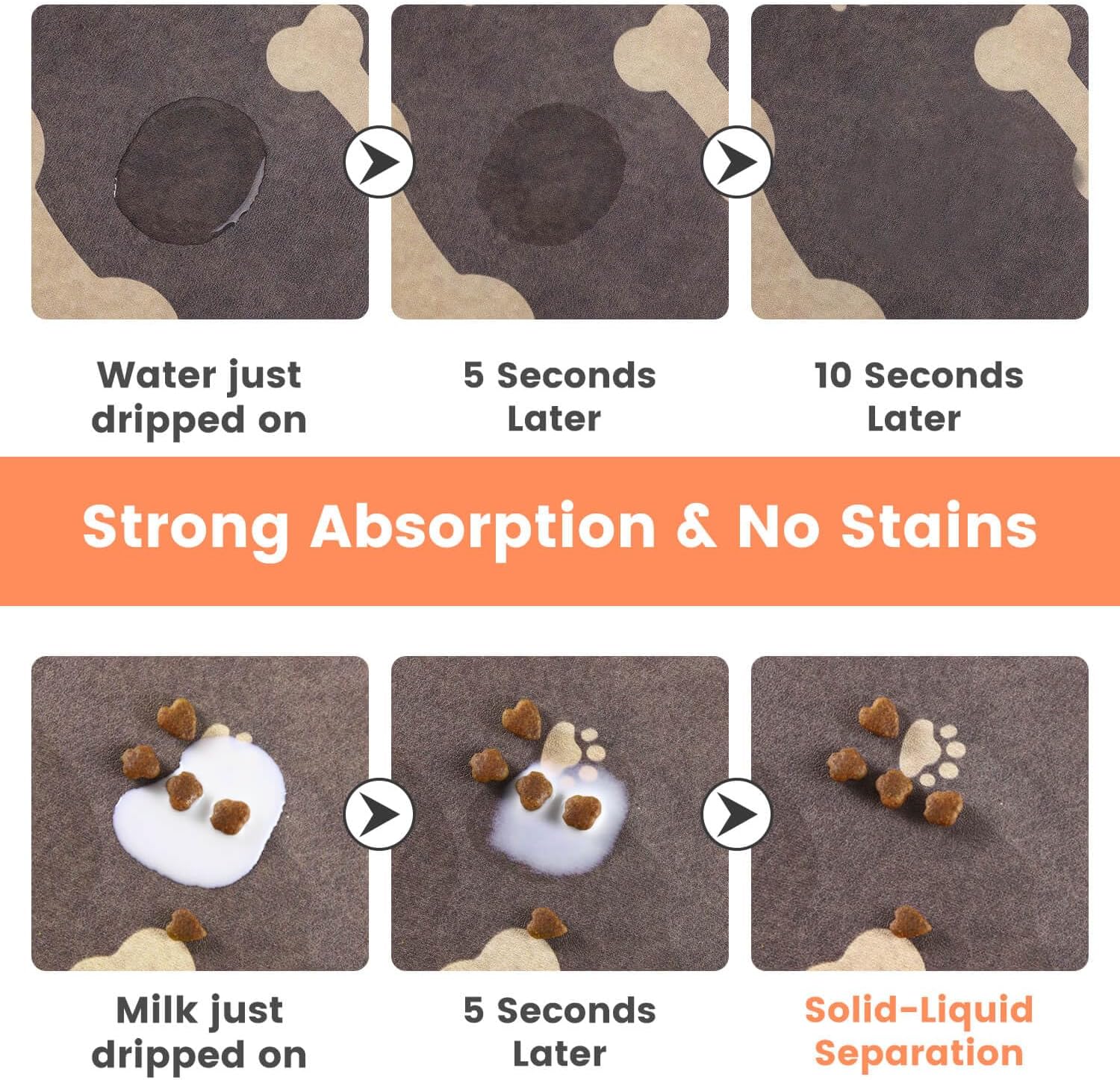 • 【Strong Absorbent & Stain-Resistant】Our dog food mat boasts exceptional absorbency, quickly soaking up any spilled water & milk and leaving no traces behind. It effectively prevents wet paws and keeps your pet's eating area clean.