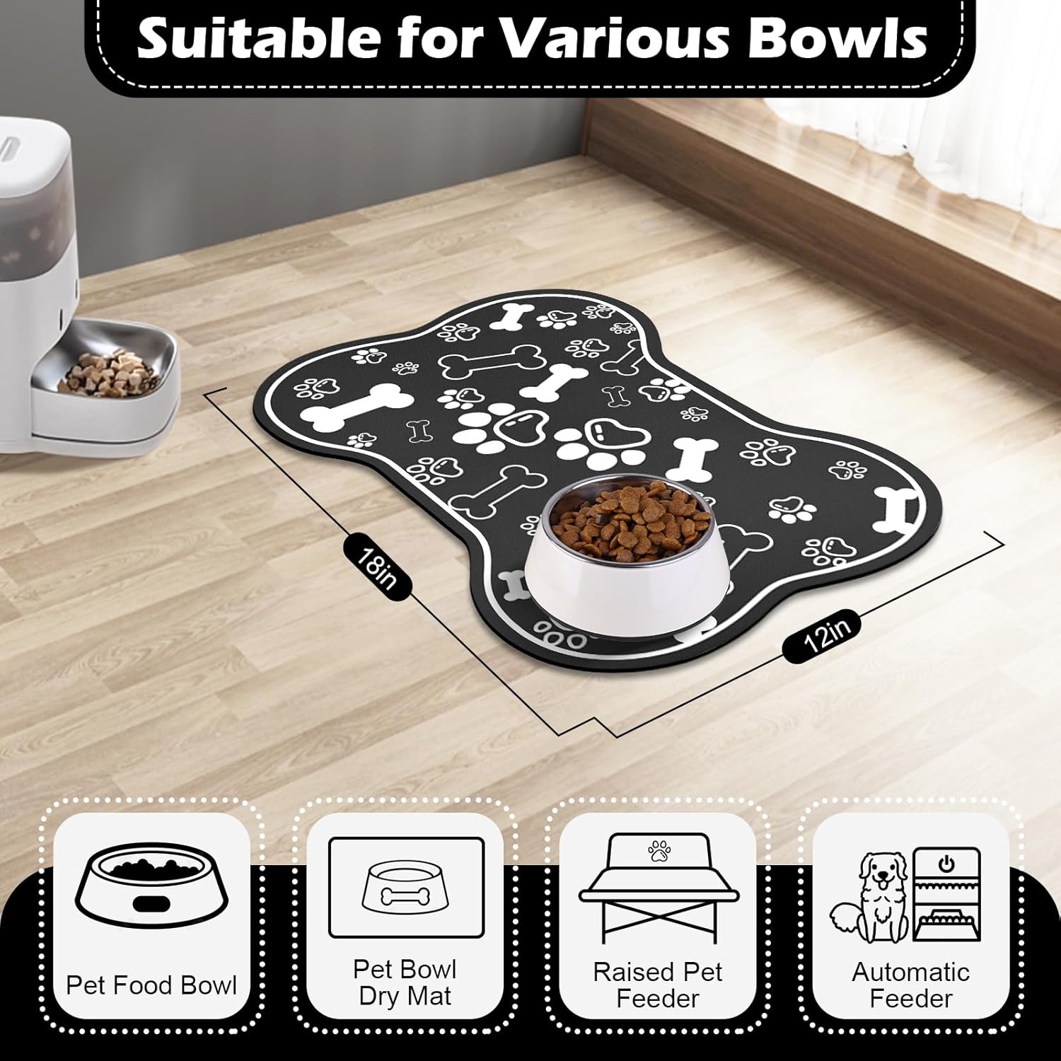 Dog Cat Food Mat,Rapid AbsorbentPet Feeding Mat, Bone Shaped Dog Placemat Water Bowl Mat with Rubber Backing,No Stains Dog Cat Food Mats Indoor, Pet Accessories Supplies 12""x18"" Black