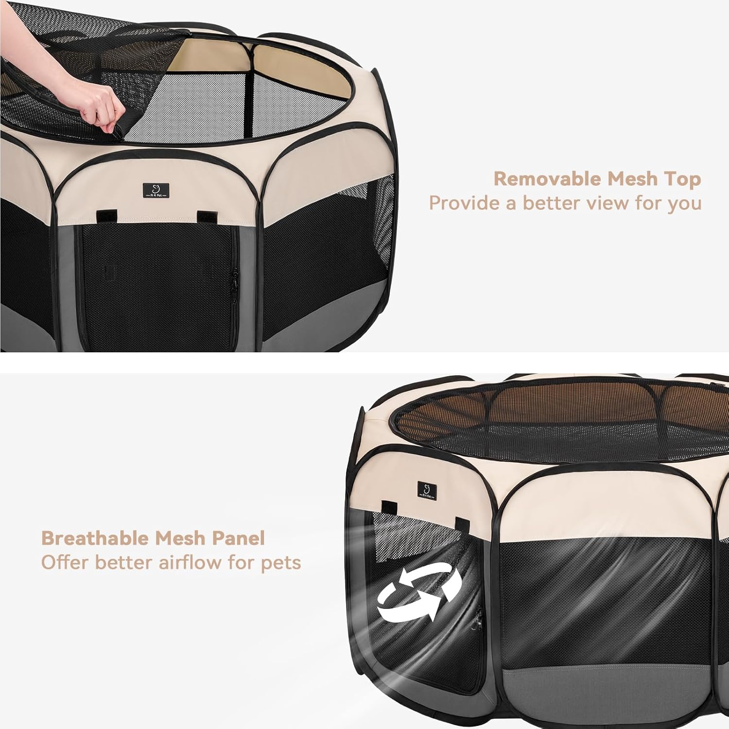 • 【Removeable Top & Waterproof Bottom】The top of this portable dog playpen can be removed by zipper so you can view your pets clearly. While the bottom is coated with waterproof PVC layer for easy cleaning.
