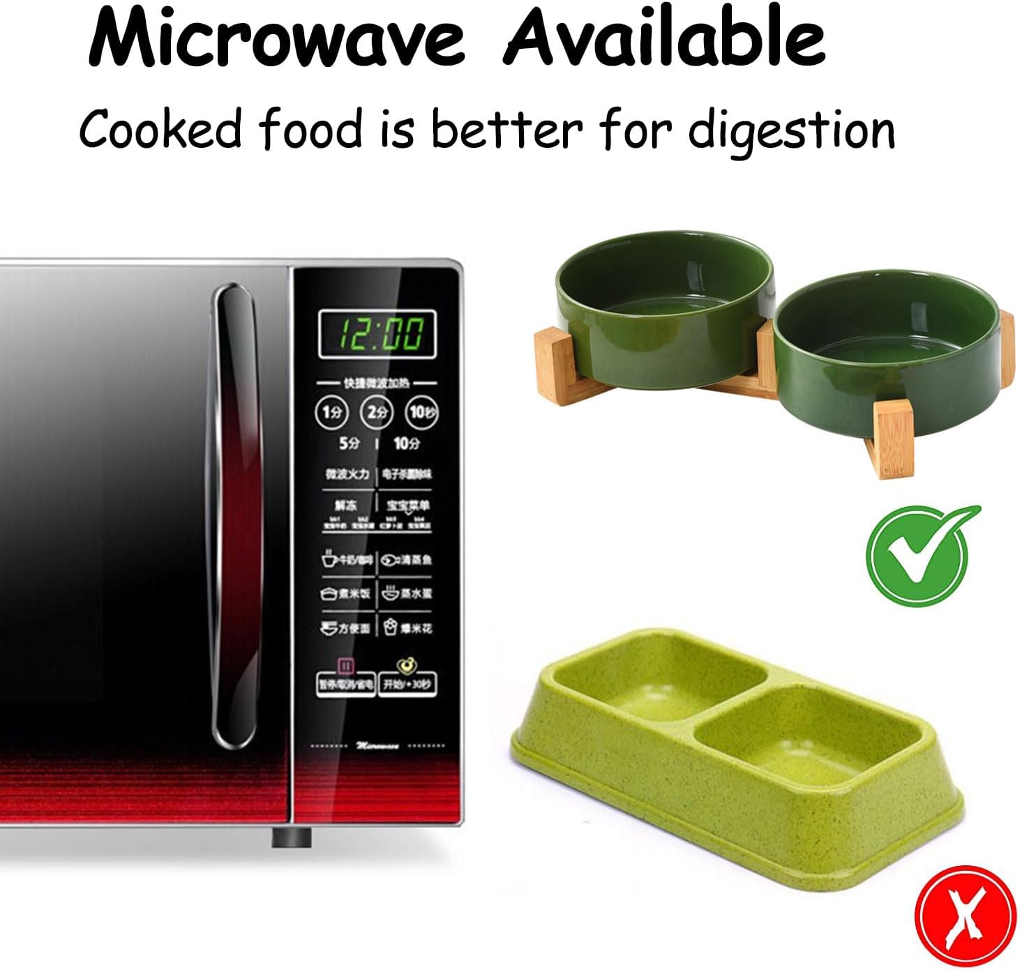• EASY TO CLEAN CERAMIC - This easy clean dog bowl set is dishwasher proof, as well as easy to handwash and wipe down. With thick walls, these ceramic bowls for pets are sturdy, weighty yet not too heavy. Double Bowl Design:One dog bowl for food and one for water, Each ceramic cat bowl has a Unique wooden stand, raising the dishes closer to your pet for more comfortable eating