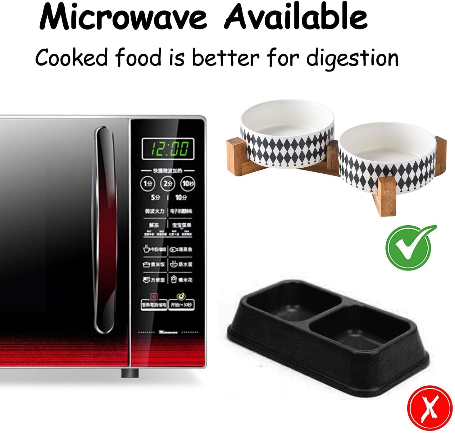 • EASY TO CLEAN CERAMIC - This easy clean dog bowl set is dishwasher proof, as well as easy to handwash and wipe down. With thick walls, these ceramic bowls for pets are sturdy, weighty yet not too heavy. Double Bowl Design:One dog bowl for food and one for water, Each ceramic cat bowl has a Unique wooden stand, raising the dishes closer to your pet for more comfortable eating