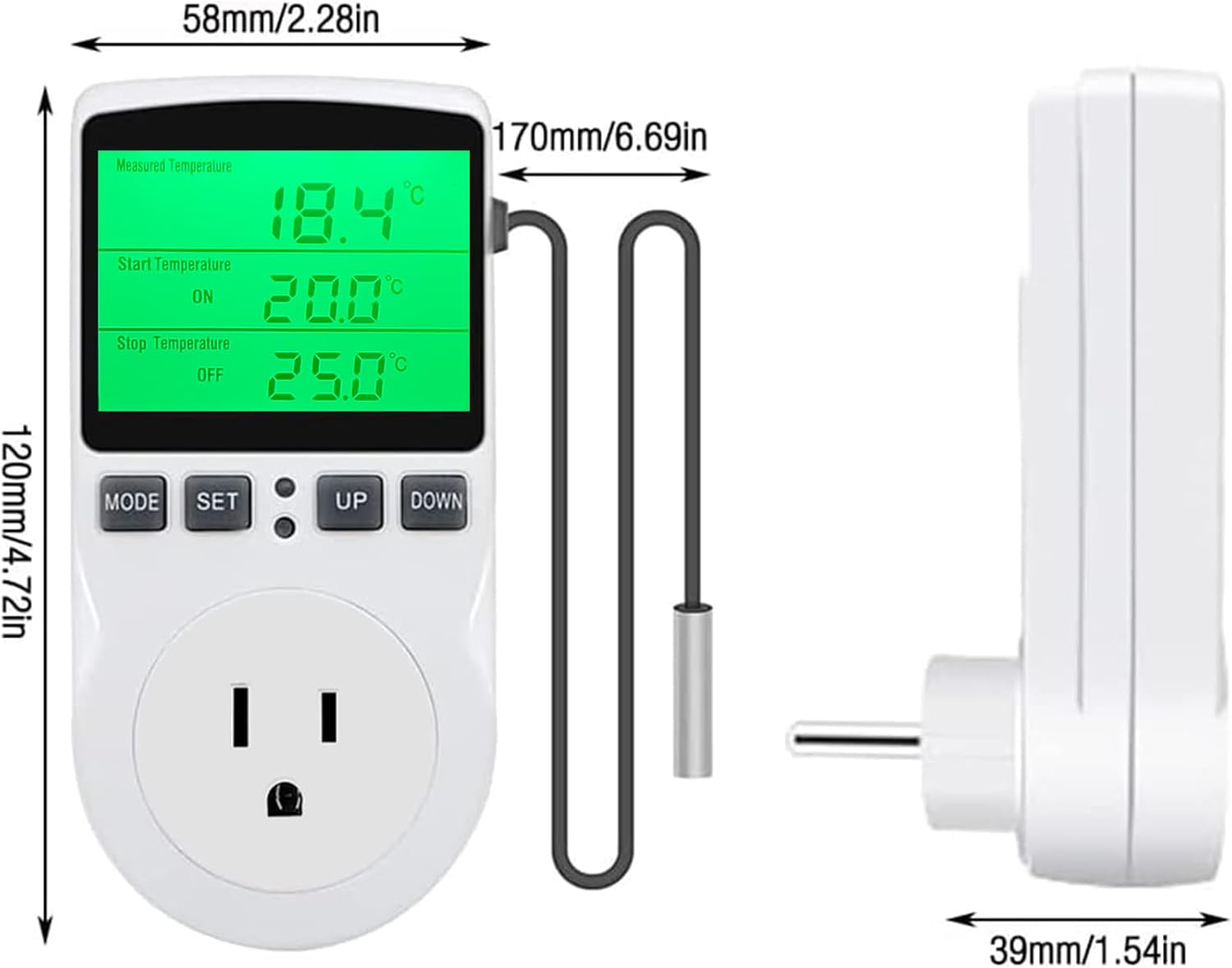 KABASI Digital Temperature Controller, Backlit LCD Screen Thermostat Heating Cooling Outlet Plug with Sensor Timer for Reptile Incubator Greenhouse Brewing Refrigerator 110V, 15A, ℉/℃
