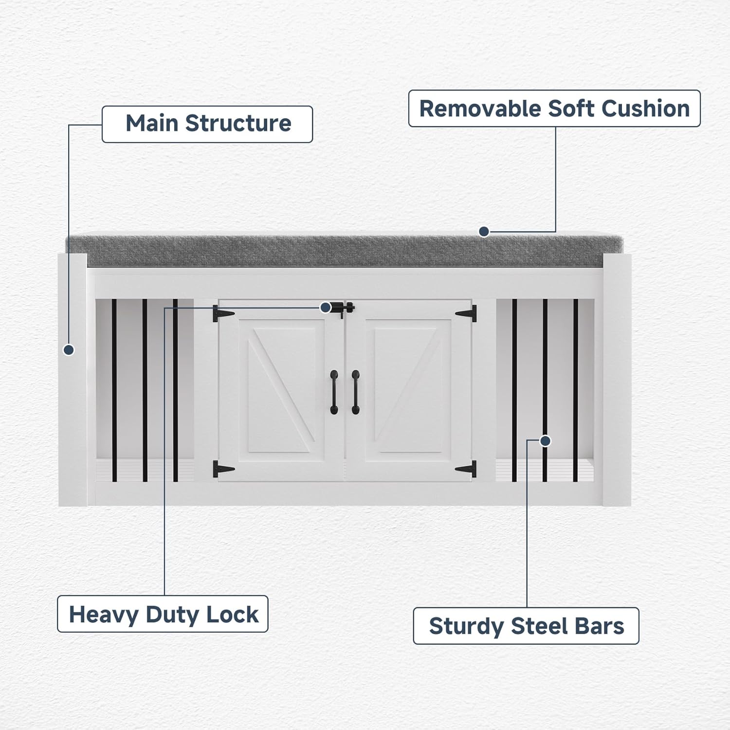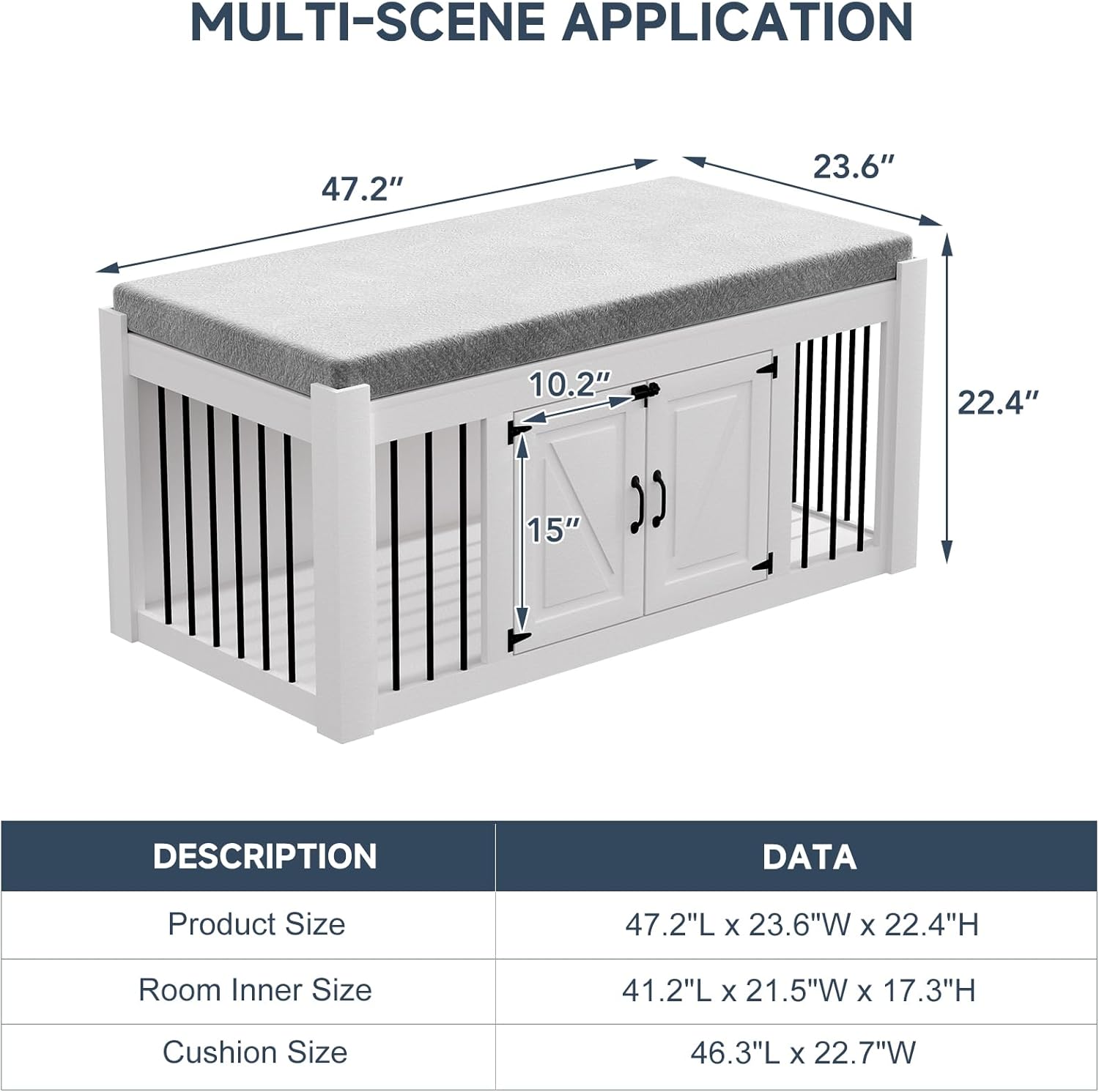• EASY UPKEEP: This dog crate bench design focuses on your convenience. With a removable cushion and easily accessible doors, cleaning and maintenance are effortless, promoting a clean living space for your pet.
