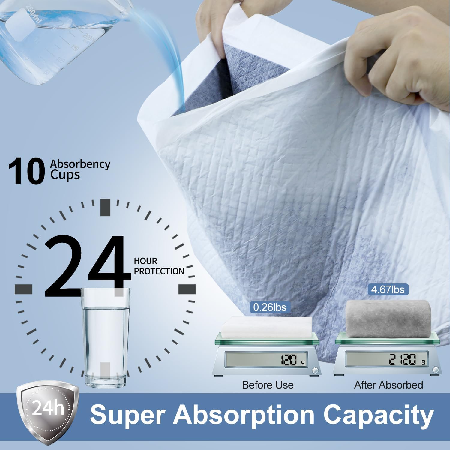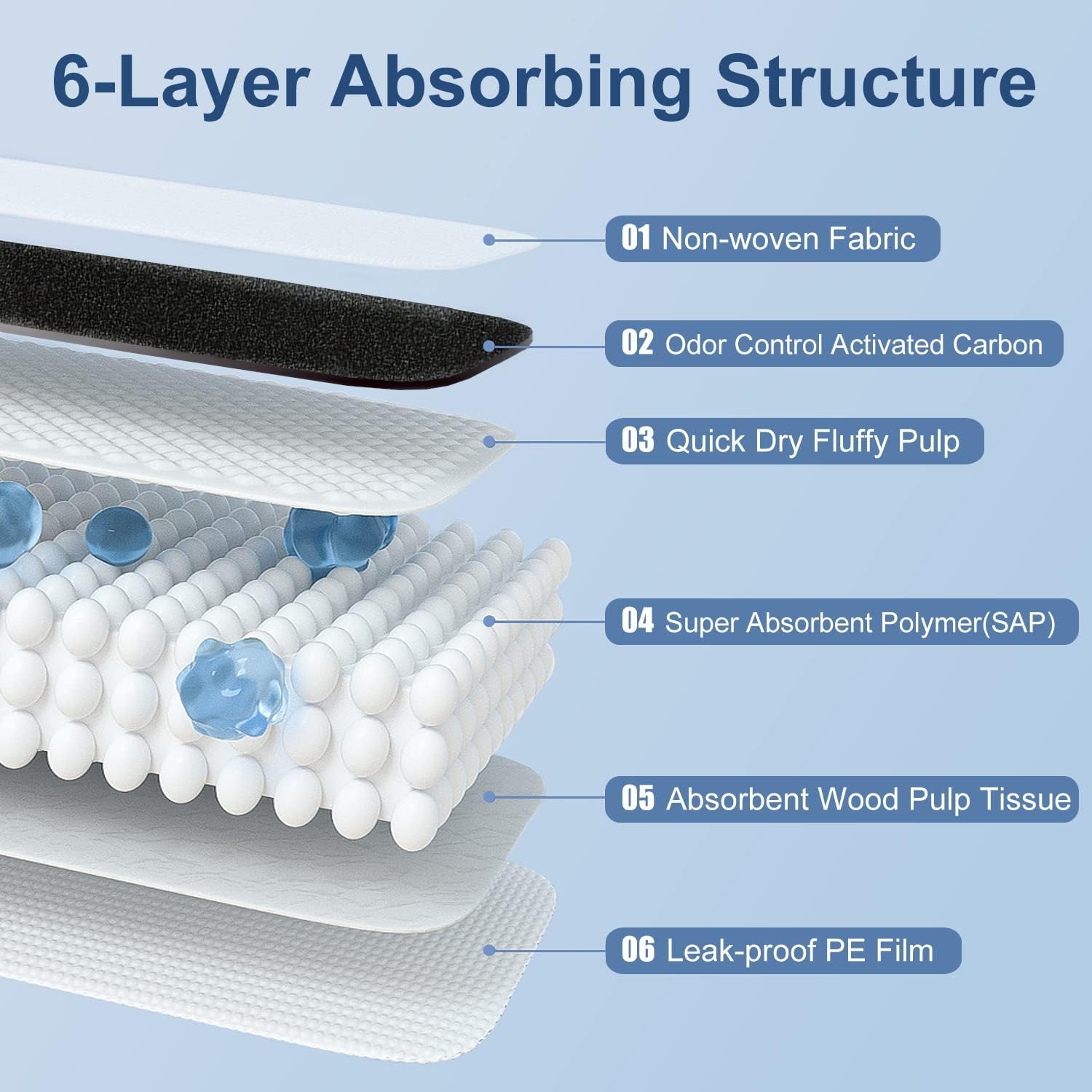 • 【6-Layer Super Absorbent Polymer】The top non-woven fabric layer to absorb liquid quickly. Second activated carbon layer helps to eliminate odors. The third layer of polymer cotton core layer can turn liquid into gel instantly, and the four layer with fluffy pulp for quick dry. The last two layers can keep liquid impermeable and protect your floor from wet.