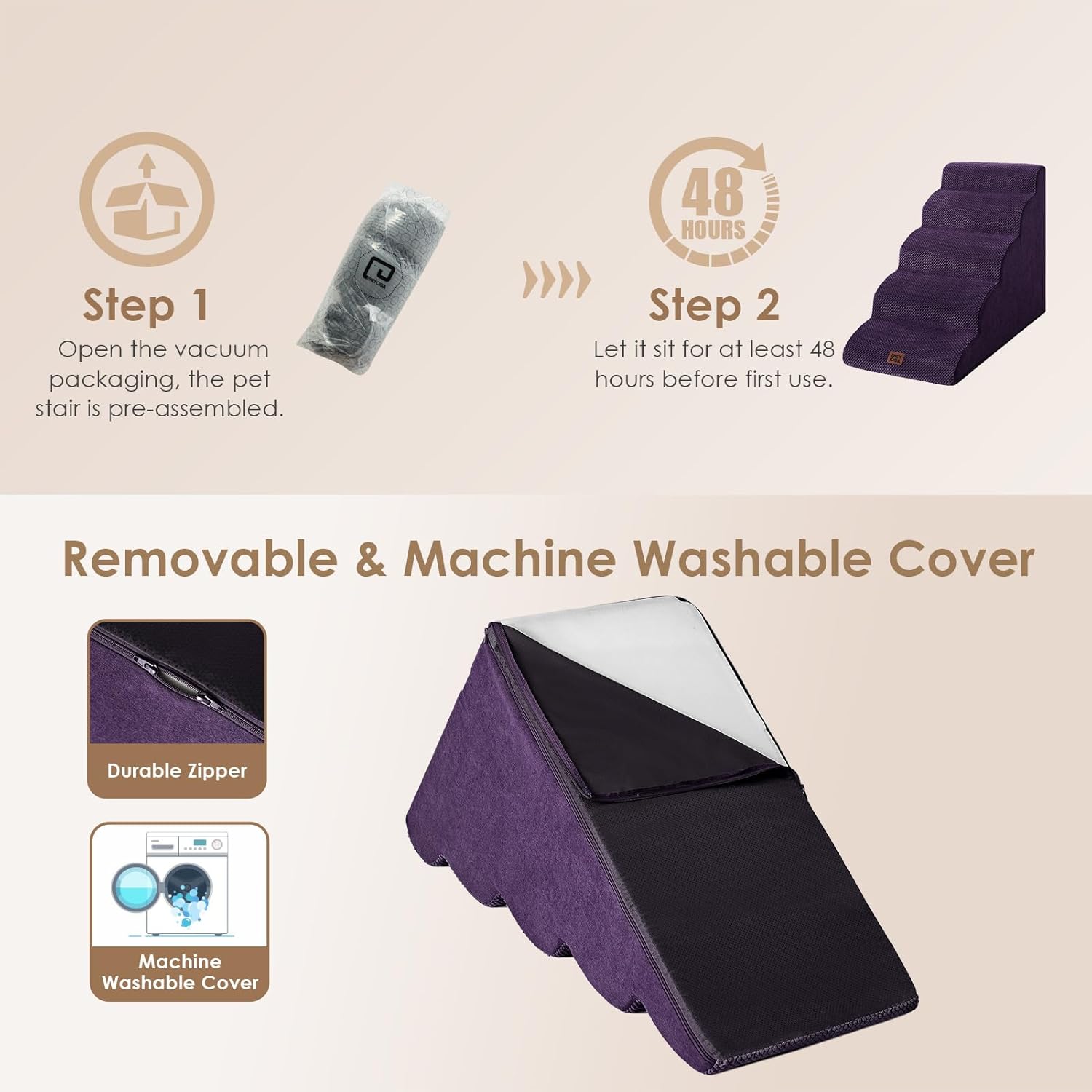 • MULTIPLE STEP SIZES - This dog stair has 2 steps, 3 steps, 4 steps and 5 steps to choose. Our 2-step stairs fits for chair/sofa/bed up to 13inch. 3-step stairs fits for chair/sofa/bed up to 17inch. 4-step stairs fits for chair/sofa/bed up to 21inch. And 5-step stairs fits for chair/sofa/bed up to 24inch.