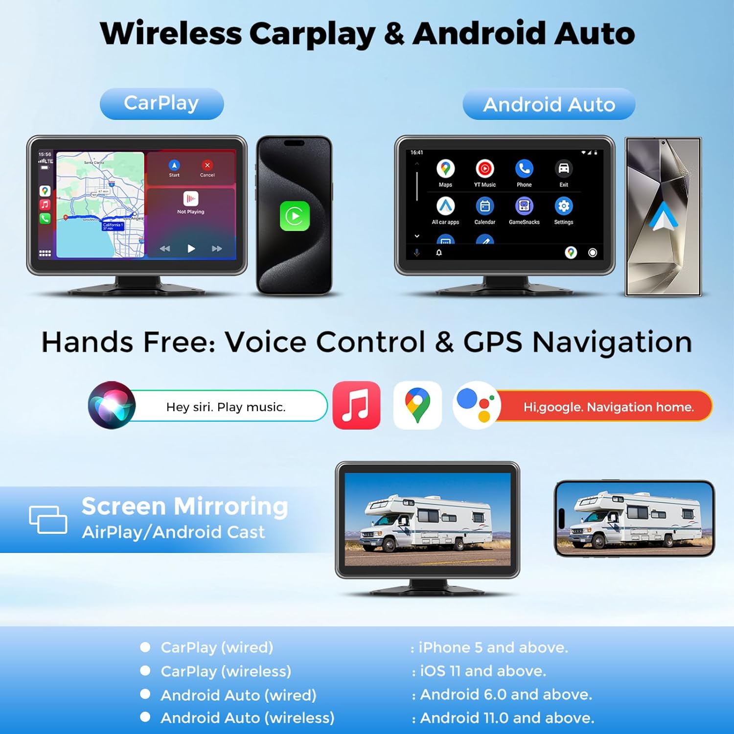 - ใAll-in-One CarPlay with Backup Camera SystemใGet ready for a whole new driving experience with this amazing CarPlay screen back up camera systems for trucks, RVs! CarPlay & Android Auto, AirPlay & Cast! The smartphone connects to the 10-inch HD full touch screen to enjoy real-time navigation, music, and video via Bluetooth or radio connection to the car stereo. With a dual-camera back up camera for truck.rv that focuses on improving driving safety, this is the ultimate driving experience!
