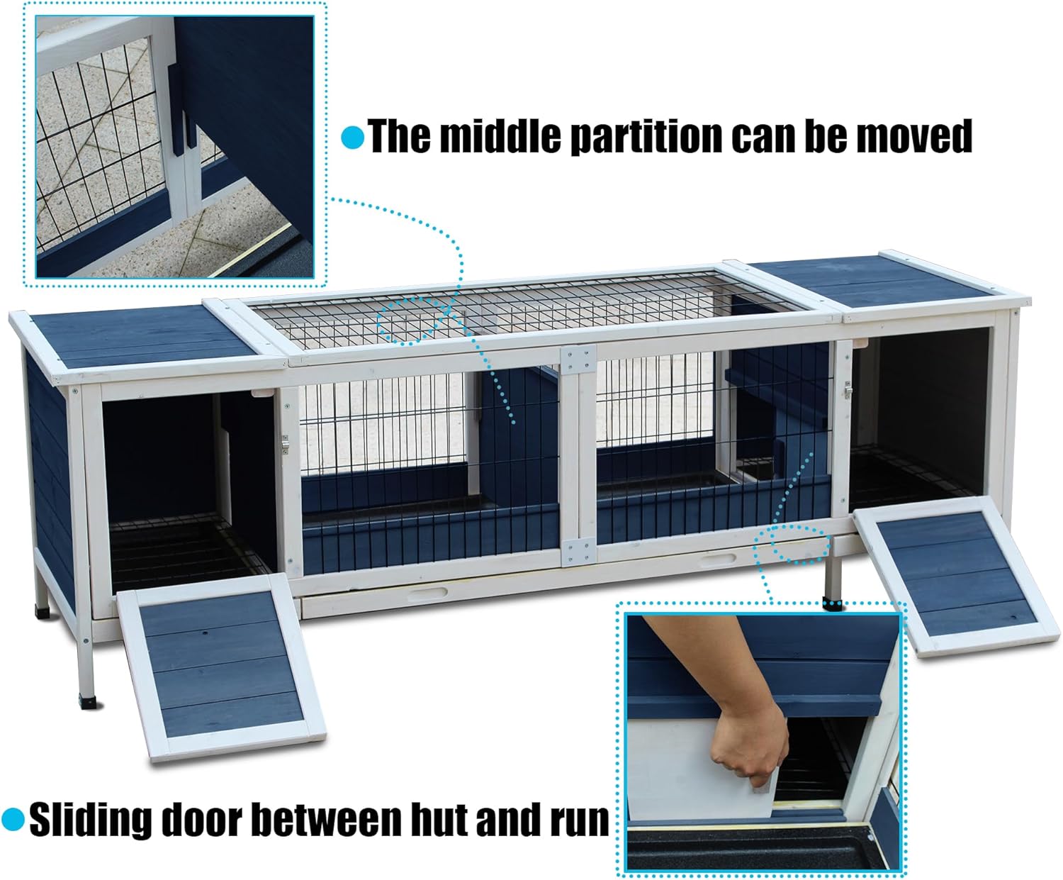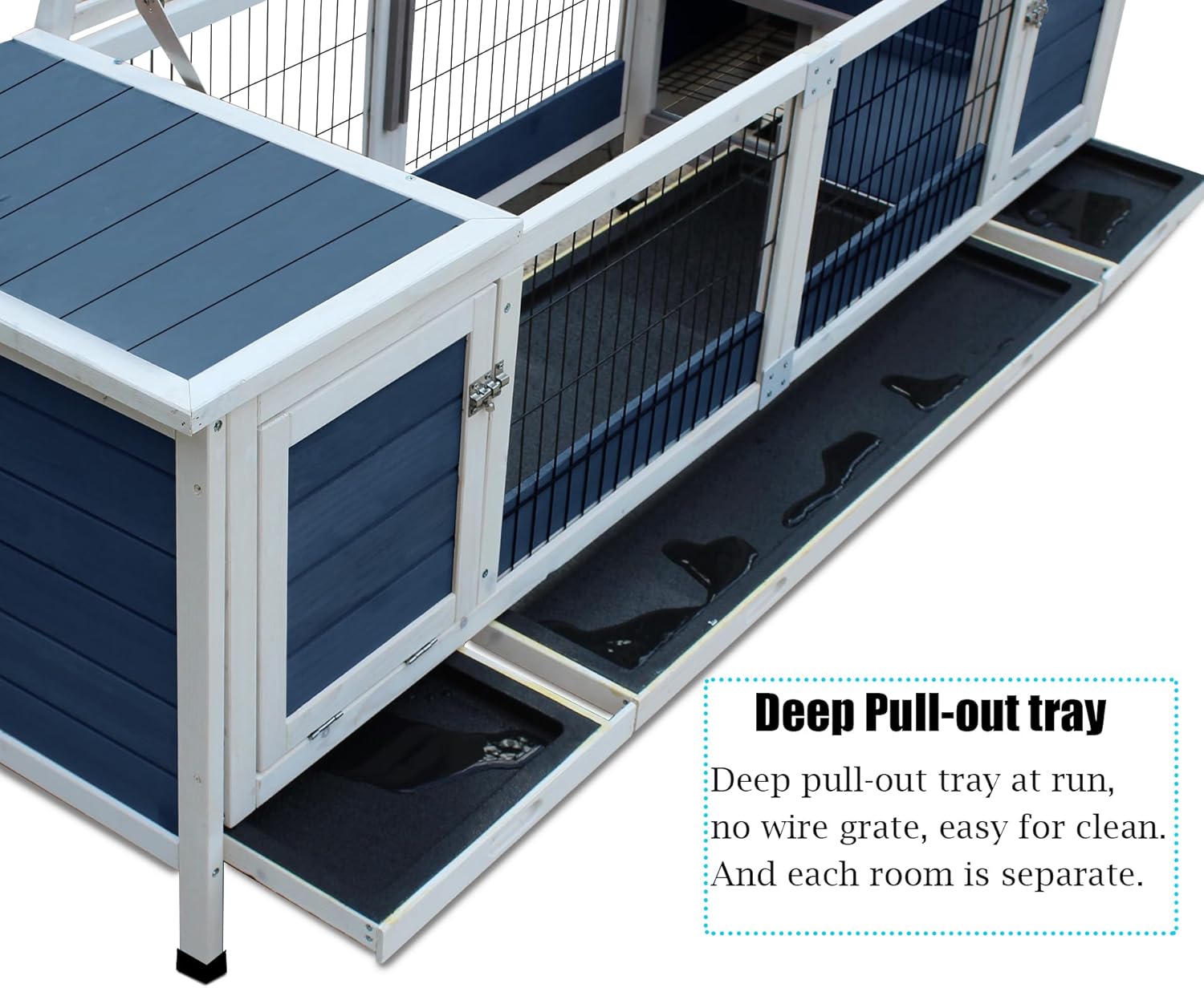 • Easy to clean: It's easy to gain access to the inside by opening the side doors and the top wire for daily cleaning. Your pets can stay in the wood hut with the sliding door locked up while you are cleaning the pull out tray