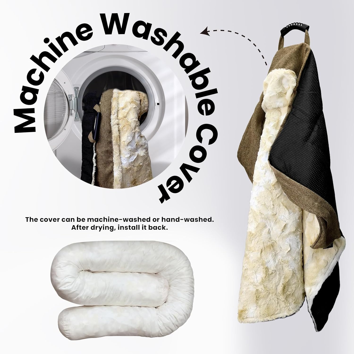 - 𝑷𝒐𝒓𝒕𝒂𝒃𝒍𝒆 𝒂𝒏𝒅 𝑴𝒂𝒄𝒉𝒊𝒏𝒆 𝑾𝒂𝒔𝒉𝒂𝒃𝒍𝒆: Designed for both comfort and convenience, the dog mat is perfect for pets on the go. With a built-in handle, it’s easy to carry. whether camping, traveling, or protecting car seats. When it’s time to clean, simply remove the cover and toss it in the wash. Keeping your pet’s bed fresh and ready for the next adventure has never been easier.