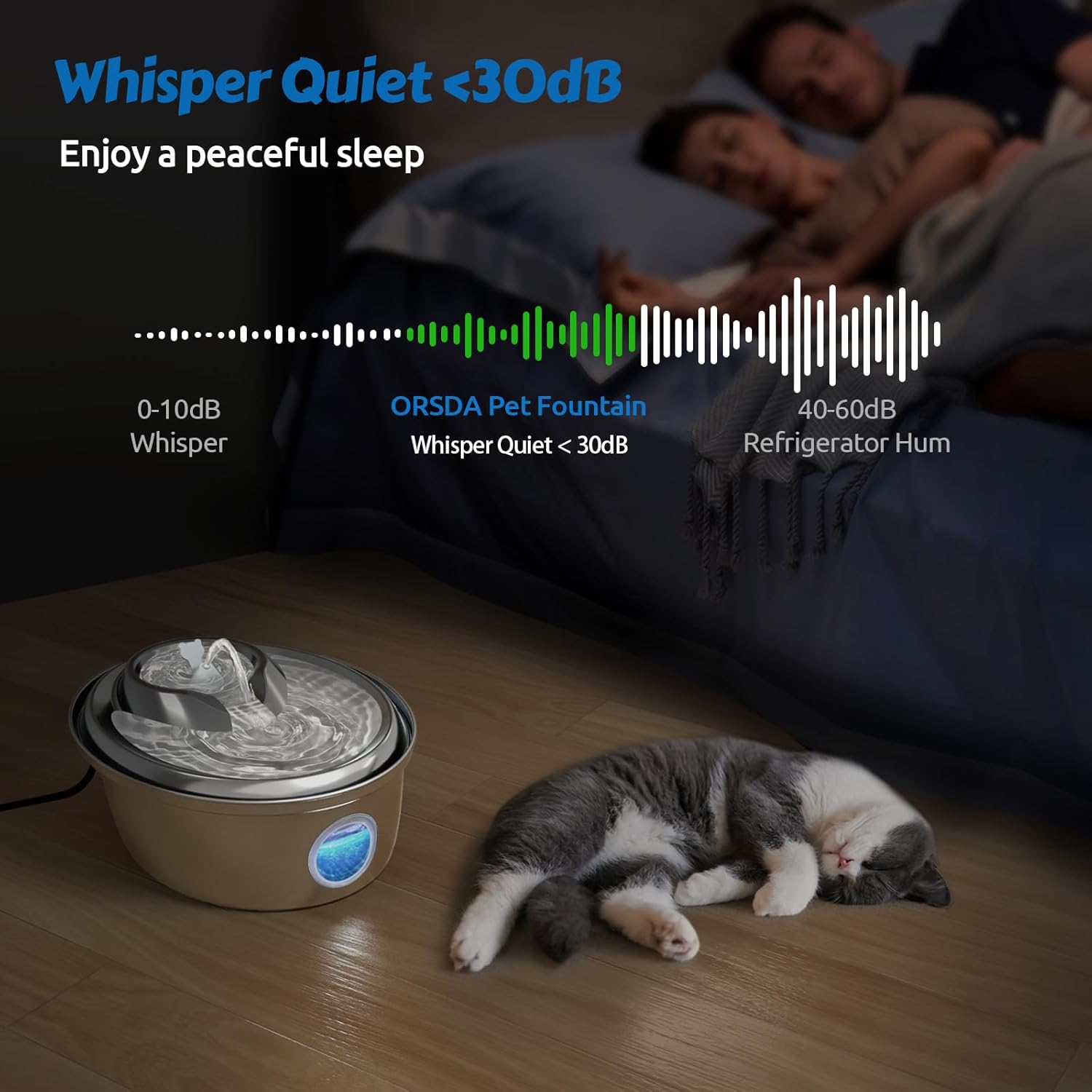 - 😽【Ultra-Silent < 30dB】ORSDA D66 3L/100oz pet fountain with upgraded 1W low consumption pump and slope water flow structure, allowing the fountain to operate quiet than 30dB, help you and pets sleep soundly.