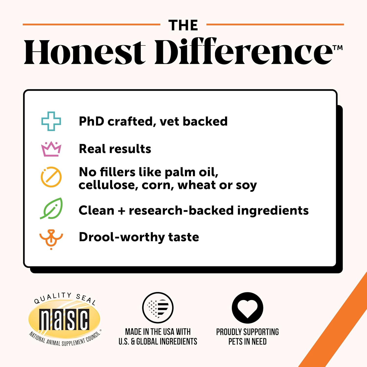• Made in the U.S.A. | NASC Member Company: All Pet Honesty products are made in the US with US and globally-sourced ingredients, meeting the highest safety standards. As a NASC member company, we adhere to strict quality and compliance standards for pet supplements. We also support pets in need nationwide through our Social Impact Committee, helping all pets live healthier, happier lives.
