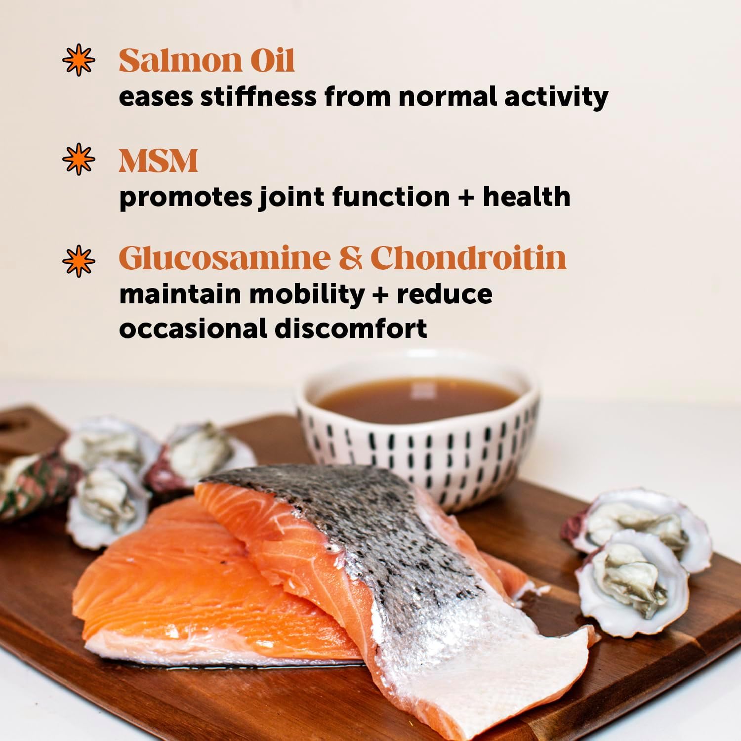 • Made with Natural Ingredients Like Salmon Oil, Glucosamine + Chondroitin, & More: For your pupโ€™s wellness, we use natural ingredients that truly work. Omega-rich salmon oil enhances mobility, while glucosamine and chondroitin support joint health and flexibility. MSM aids in joint function, and fish oil benefits joints, skin, brain, heart, and overall health. Collagen-rich bone broth adds a protein boost.