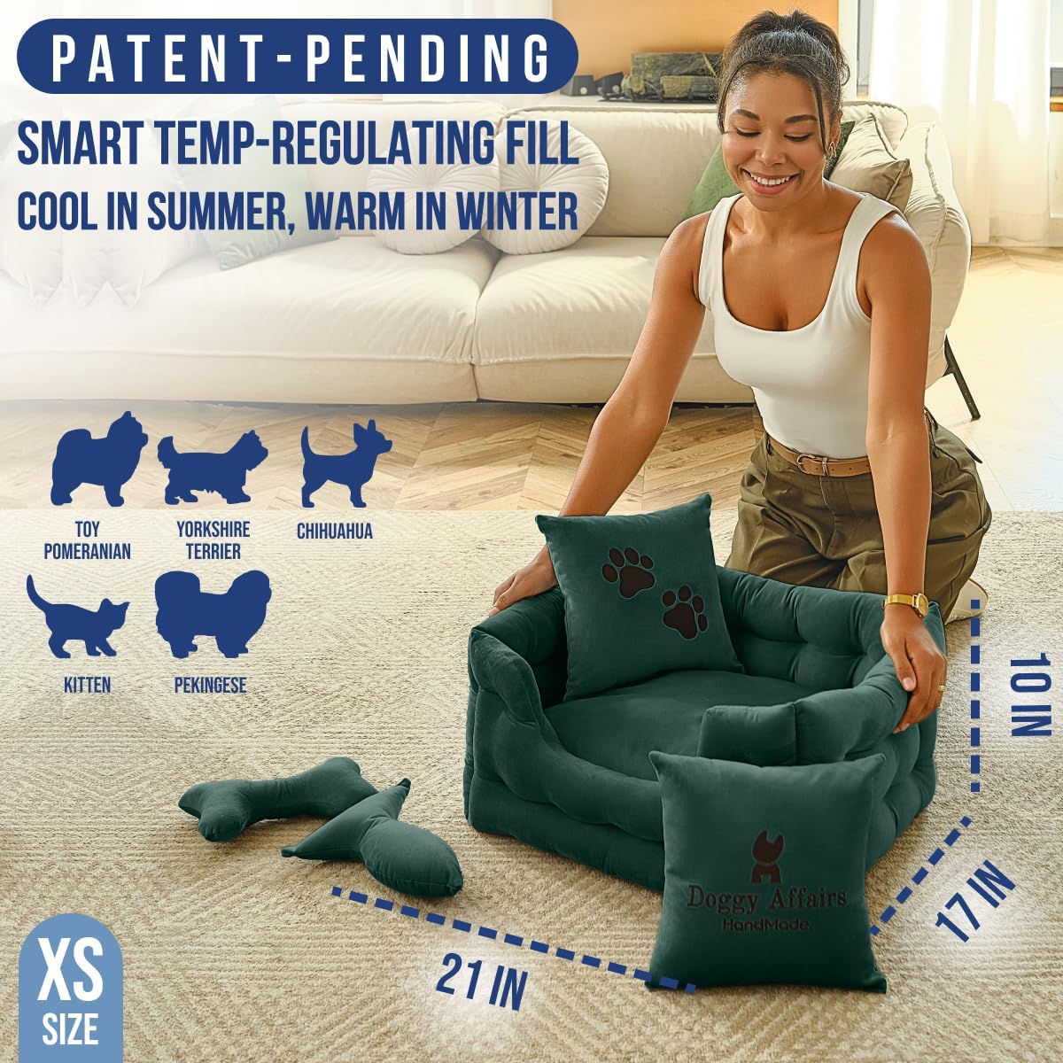 • JOINT SUPPORT COMFORT & TEMP REGULATION: Premium cushioning supports joints, hips, and growing bones, while smart fill keeps her cool in summer and warm in winter. The only calming dog bed that truly hugs her back like your arms.