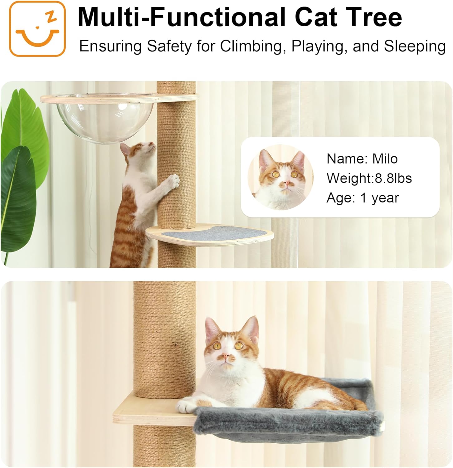 • SATISFY NATURAL INSTINCT - Cats naturally like heights, climbing to high places can burn off their excess energy and enhance their sense of security. This 6 level tall cat tree comes with ex-large soft hammock, 360°view transparent capsule, semi-enclosed cat condo and view perch. Cats can nap, scratch, and play in this cat climbing tree, one cat tree can satisfy all their needs.