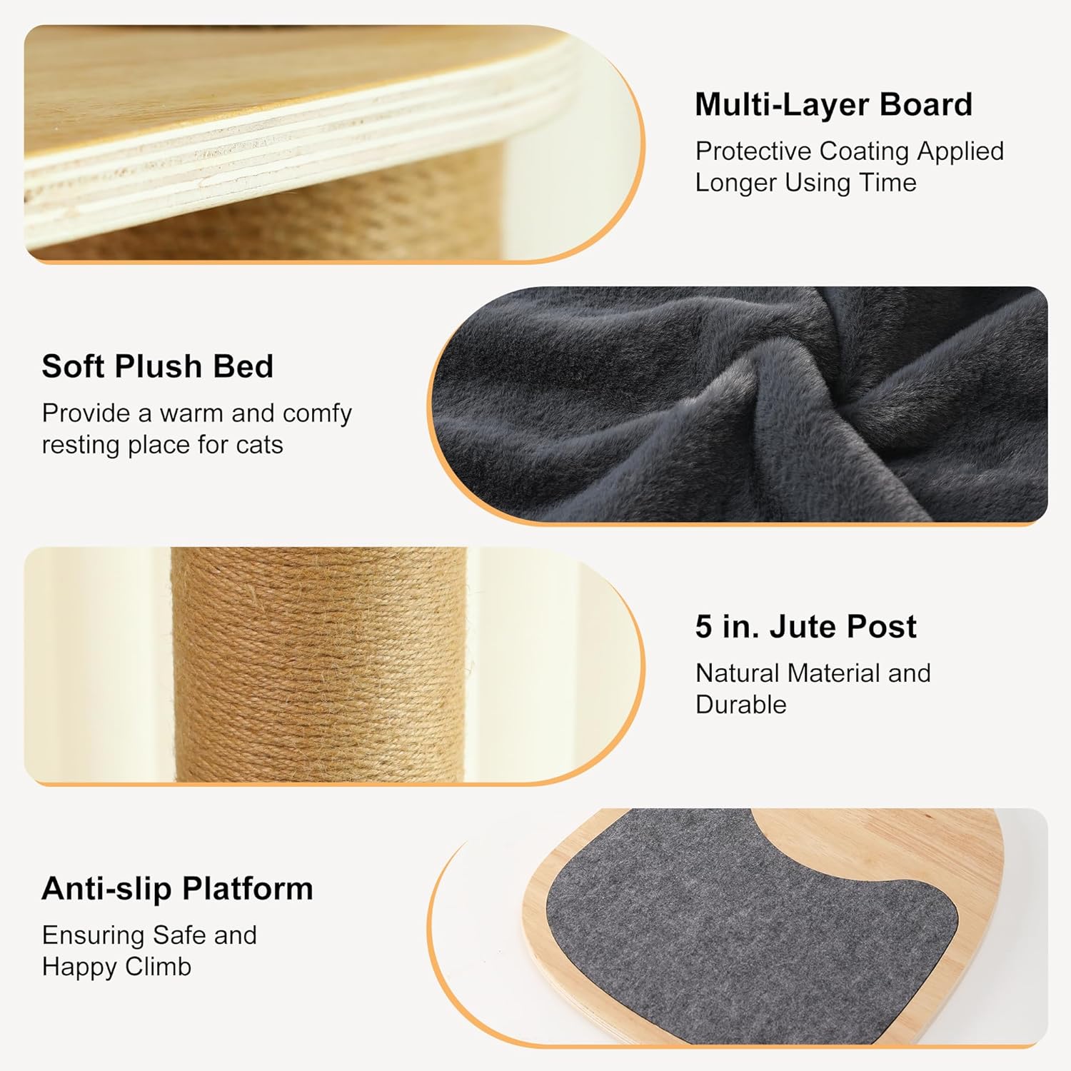 • PREFERRED MATERIALS - The main structure of the cat tree is made of rubber wood plywood and jute, durable and can withstand the scratching and weight of cats, extending the service life. Soft plush and felt mats are used on the viewing shelf to ensure the comfort and safety of pets.