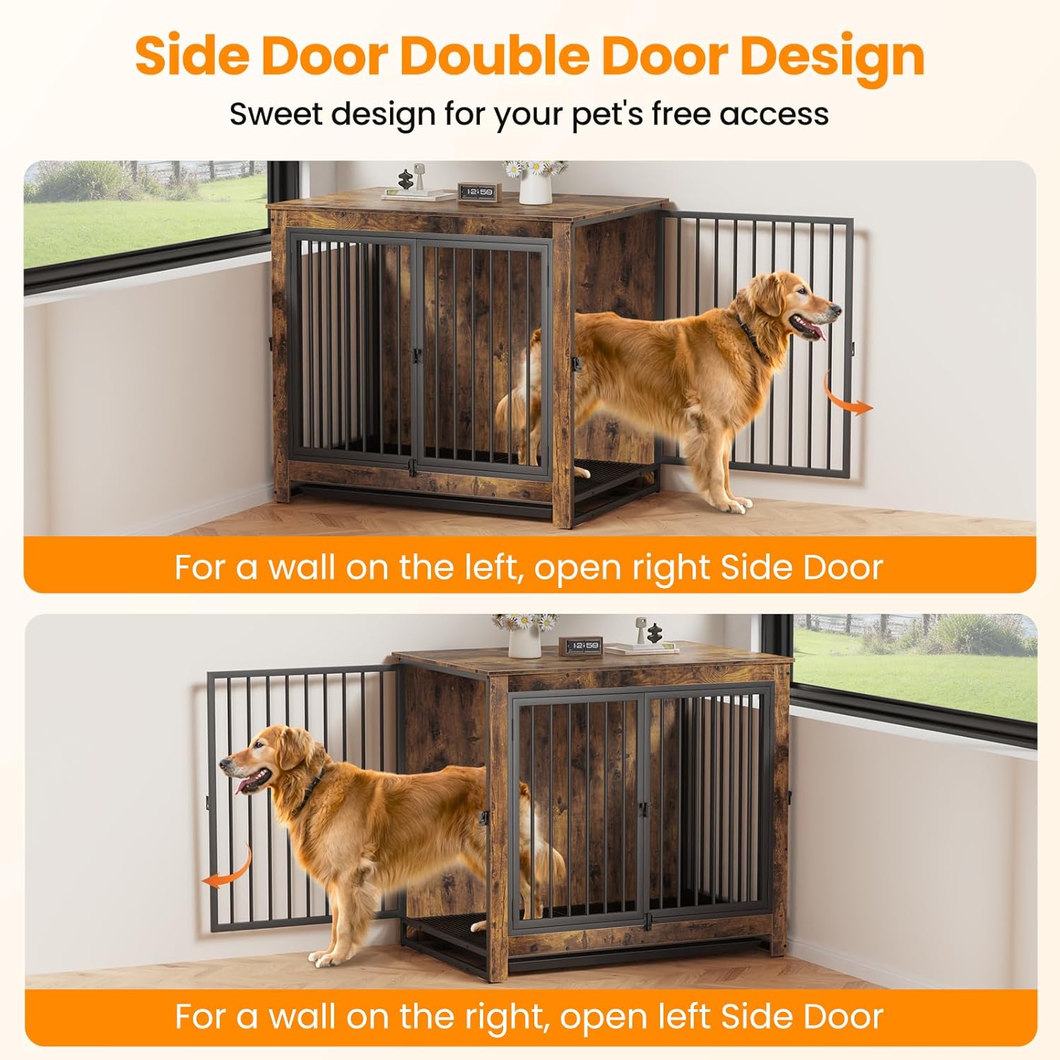 • 【Double Side Door Design】This furniture-style dog kennel indoor has front and two side openings for access, both the left side door and the right side door can be opened to fit various spaces, definitely an ideal crate for your home