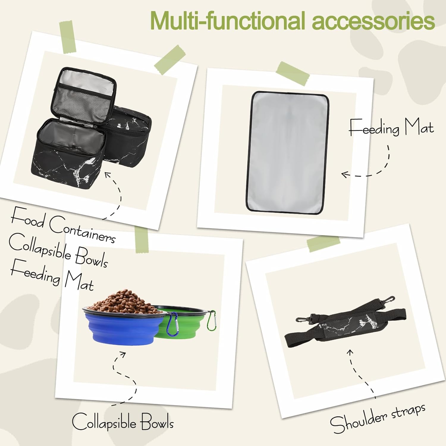 • 【Travel Bag For Dog Kit Include】: 1 Dog Tote bag, 2 Dog Food carriers bag, 1 Water-Resistant Placemat, 2 Pet Silicone collapsible bowls (The colors of the bowl are randomly matched). This dog travel tote bag is the ultimate food storage and supply gear for any trip.