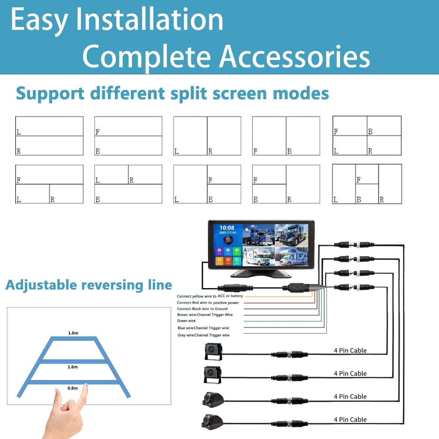 • Touchable 10.36 inch 4K Monitor:Wide 10.36 inch Screen,so we can observe 100% road situation.Larger screen,safer driving.2 split screen,2 channels,2 different angles help us to get a 360 degree view.For rear,parking, front, side,left,right,hitch,turn signal view.We also can choose the monitor to display 1/2 cameras' image.We can drive confiedntly.