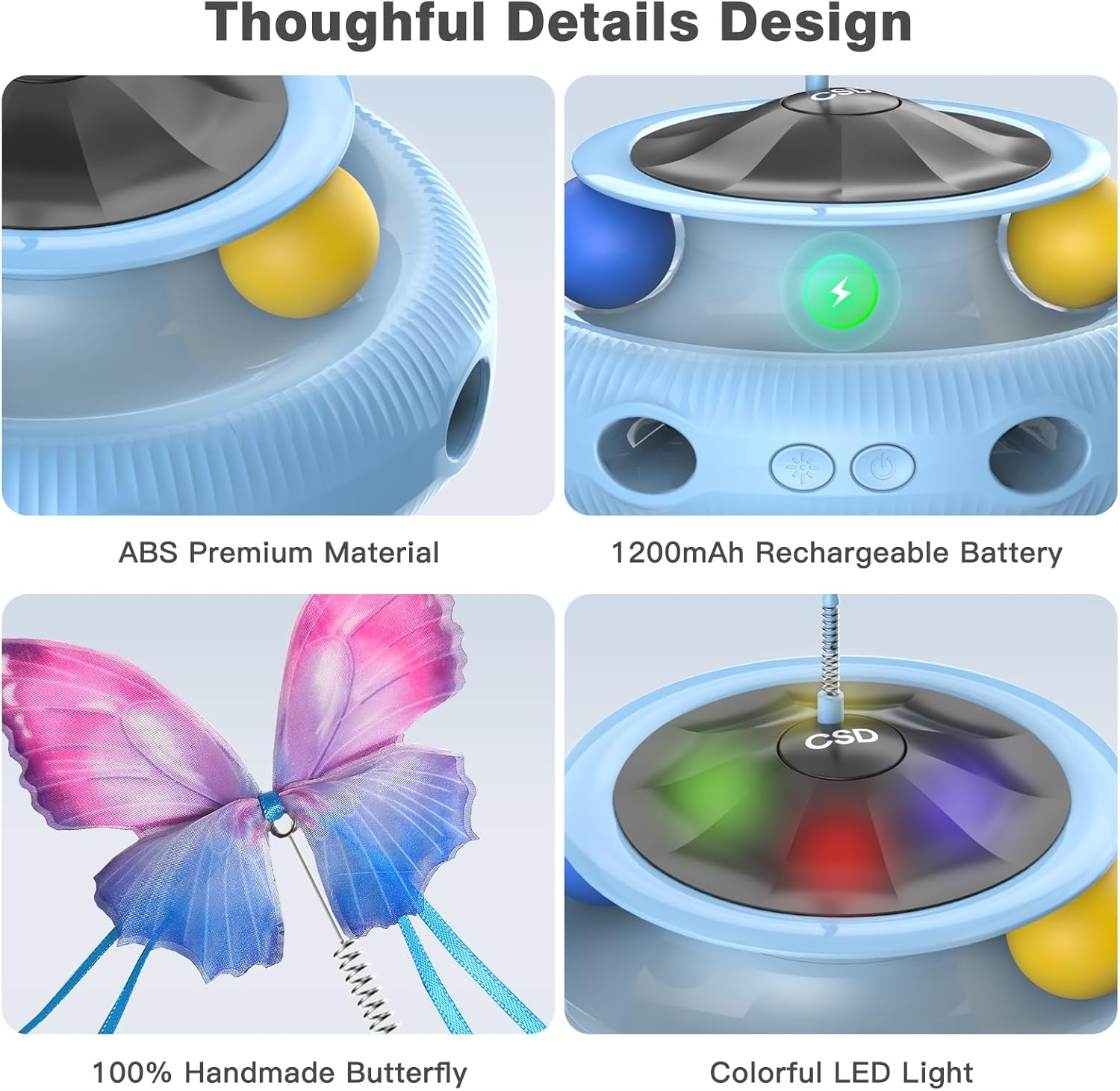 • Multi functional interactive cat toy:The cat stimulation toys for indoor cats,it combines with cat fluttering butterfly toy,track ball toy and random shooting feather toy,which provides cat's hunting instincts: chasing, pouncing,ambushing.And multiple play modes keep the kittens entertaining