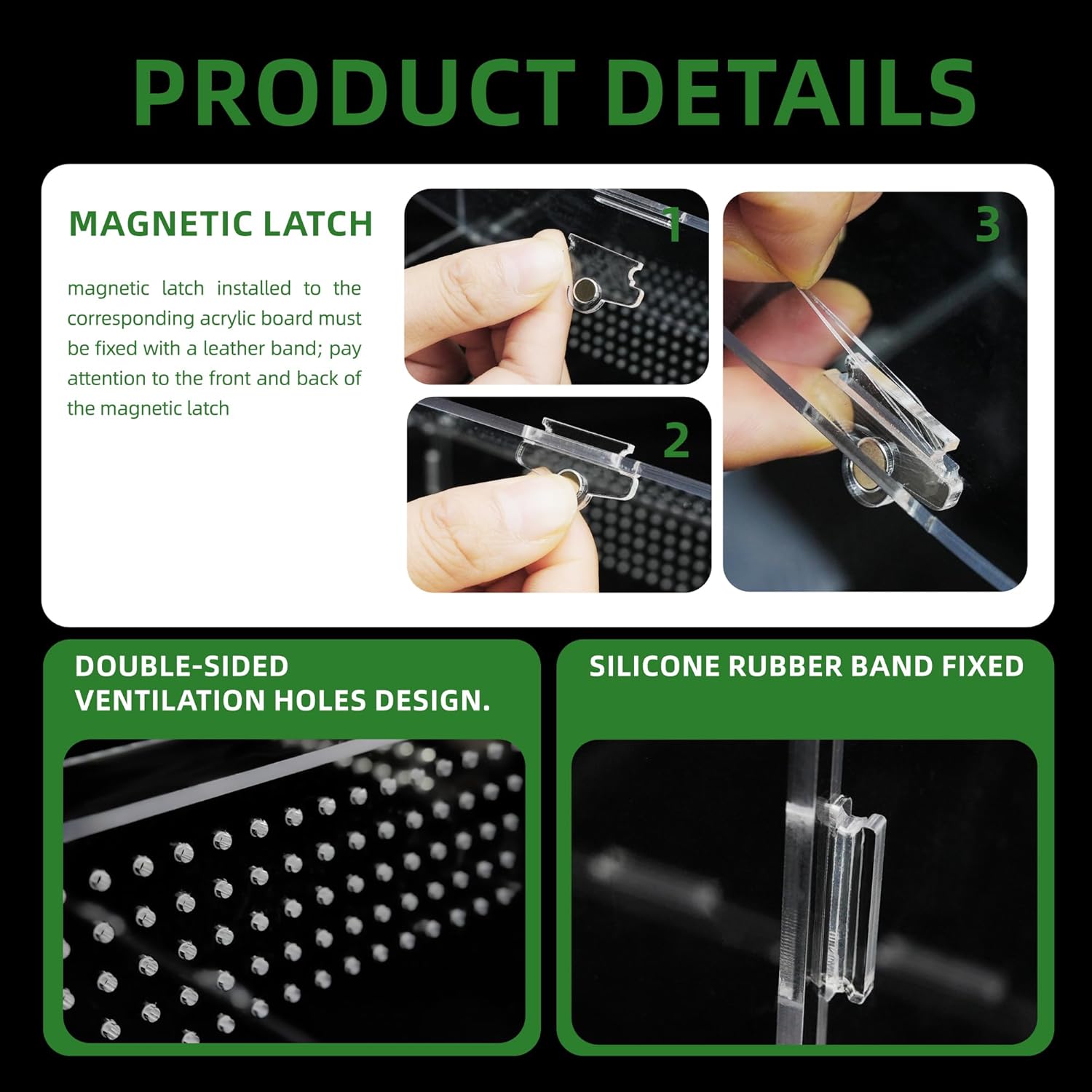 • 360 Degree View: 4x4x8 Inch large acrylic reptile enclosure is all-round transparent, it's convenient to observe your slithery friends in the terrariums and feed them in time. The magnetic lock design, easy to open and close.