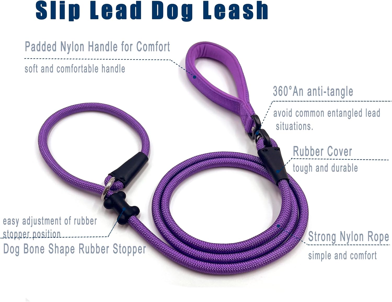 • Customized Slip Lead: An anti-tangle slip lead that is stiff enough for walking your dog, yet soft enough to move freely. When your dog moves in different directions (especially when walking multiple dogs), this lead will not tangle because it is constructed to move in line with your dog's movement, not the other way around, to avoid the very common tangling lead situation.