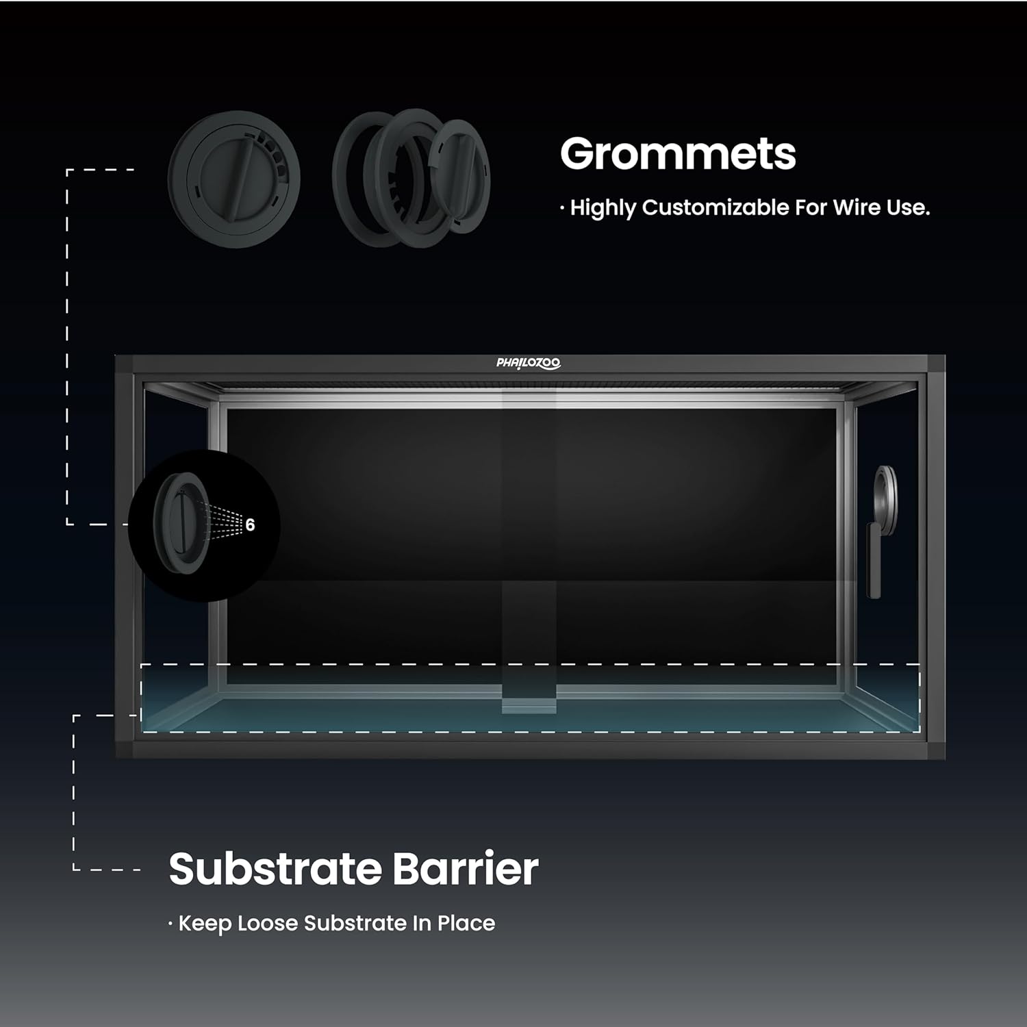 • ใ€Easy Maintenanceใ€‘Front opening reptile terrarium with door handles included for easy cleaning & feeding. No more suction cup problems or unsightly fingerprints all over. The substrate barrier keeps the substrate in place. Our tempered glass doors are durable enough to withstand scratching.