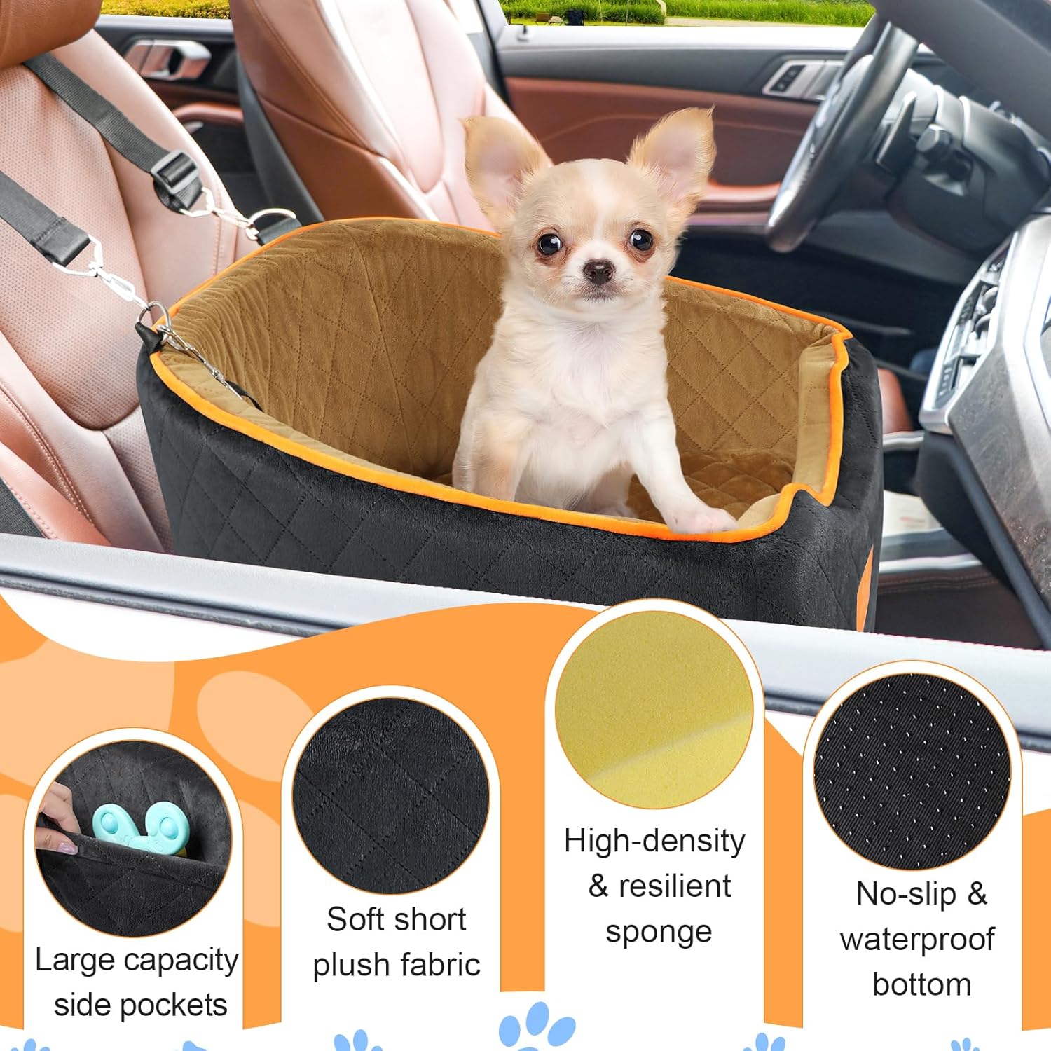 • Comfortable and Secure: The pet car seat is made of high-quality breathable fabric with a super soft plush rim, providing plenty of room for small dogs to readjust and get comfortable. The firm foam construction maintains its shape, offering a soft and cozy place for your dog to relax in extreme comfort. The non-slip bottom and safety tethers ensure that both your dog and the seat stay securely in place, preventing any sliding around while driving.