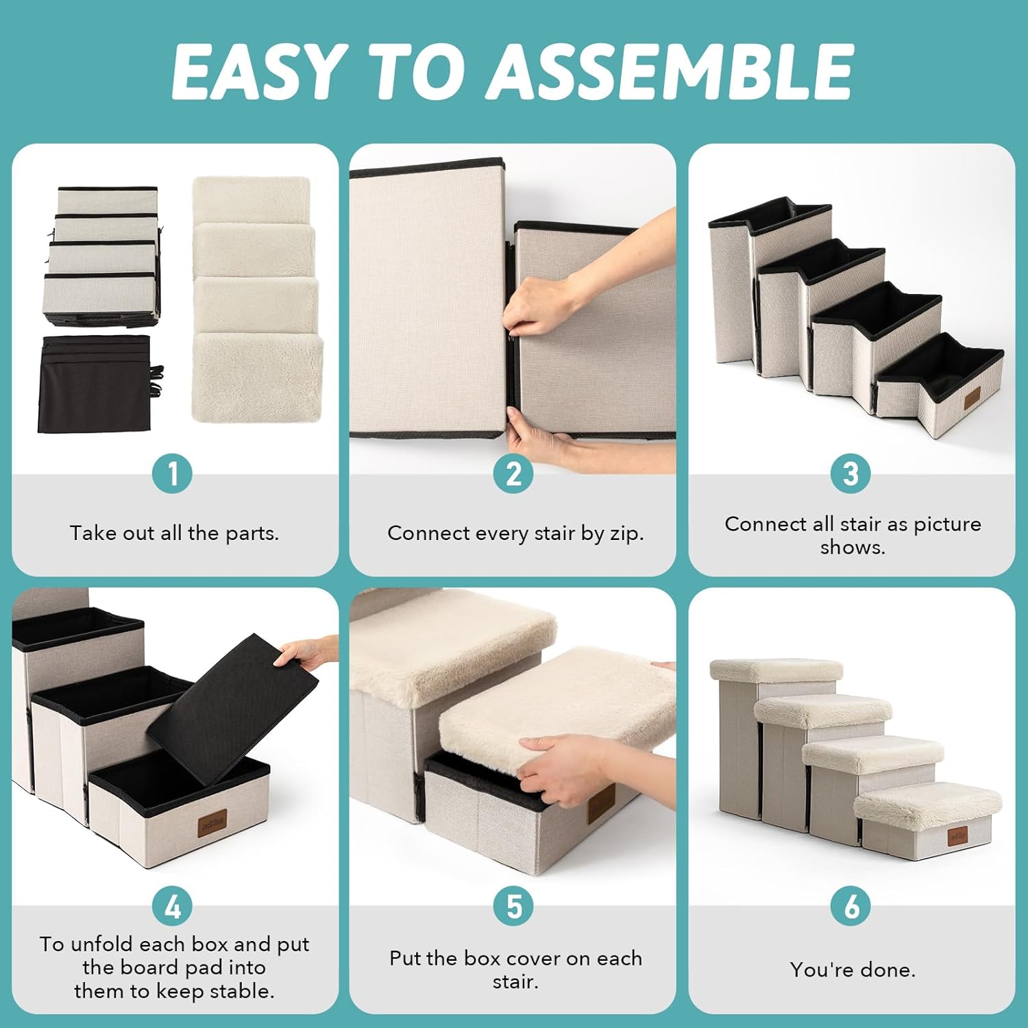 • 【Dog Stairs - Easy to Assemble】First, connect the zipper on each step, then fully unfold each step. Next, place each support board into the corresponding storage box and cover it. When not in use, simply remove the cover and store the stairs after folding them completely. This helps save space, making it ideal for small rooms. You can also watch our installation video in the product description below.