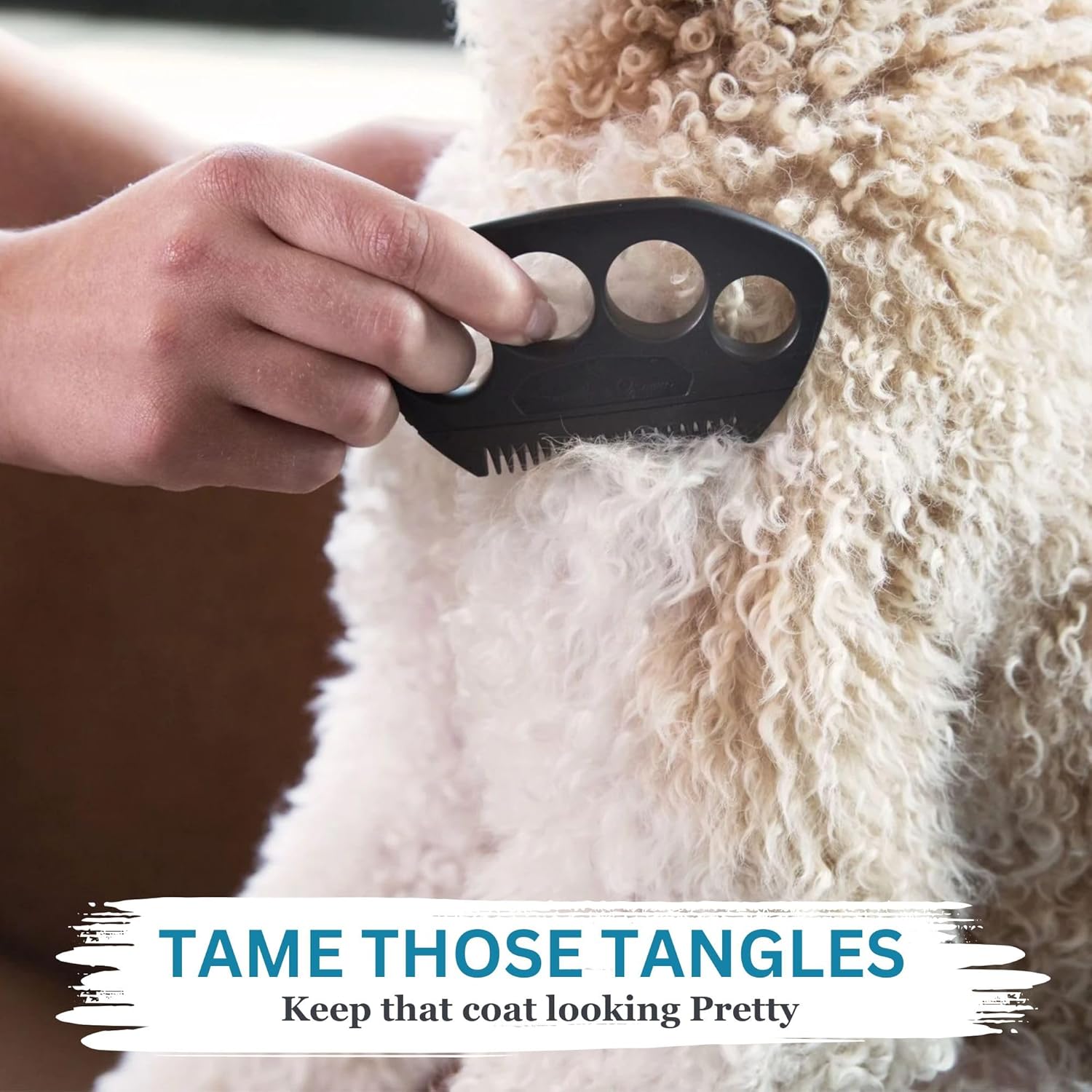 • Plastic comb with comfortable finger holes. Can be used with either hand. Will take care of stubborn mats and tangles.